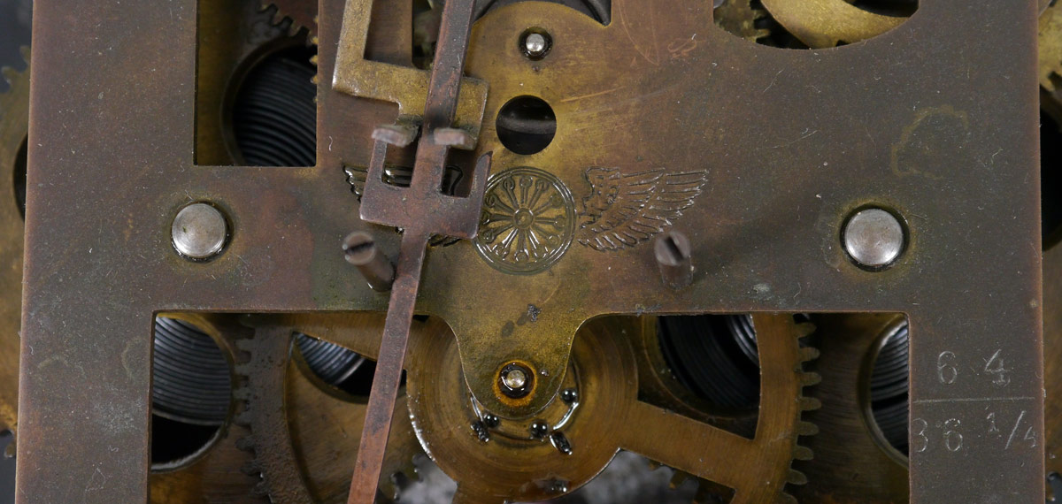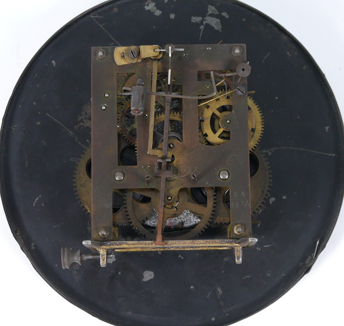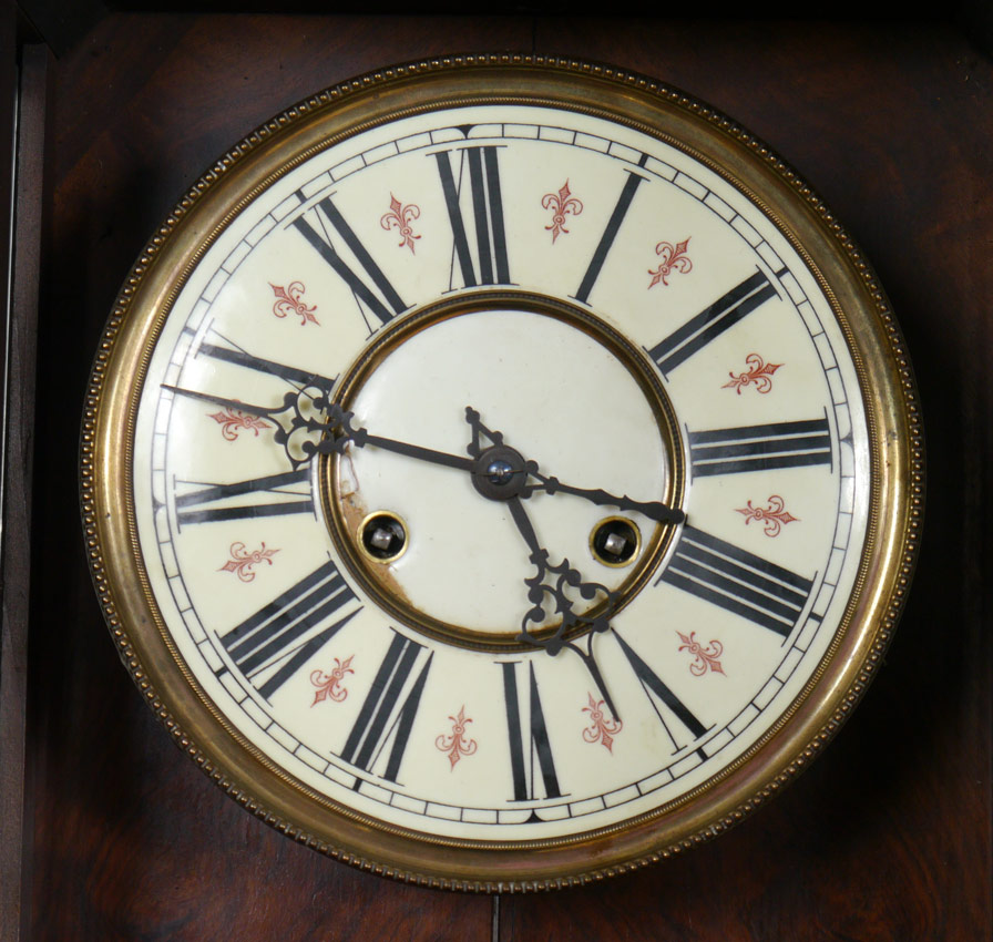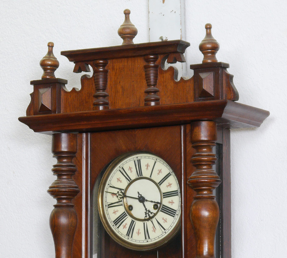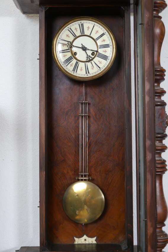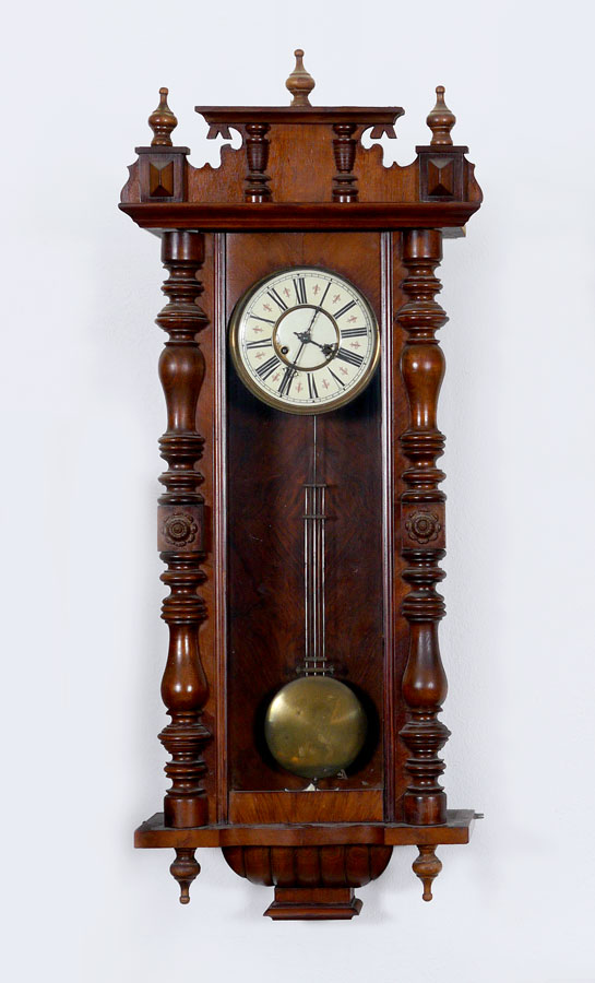 KENZIEL VIENNA REGULATOR WALL CLOCK: Removable architectural pediment with applied decoration, case with applied carved and turned half columns. Burl walnut veneer back panel. Porcelain dial with Roman numerals, Kenziel time and strike movement. No key. Overall 44 1/2'' x 18 1/2'' x 7 3/4''.