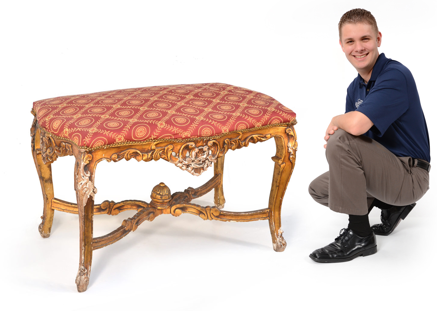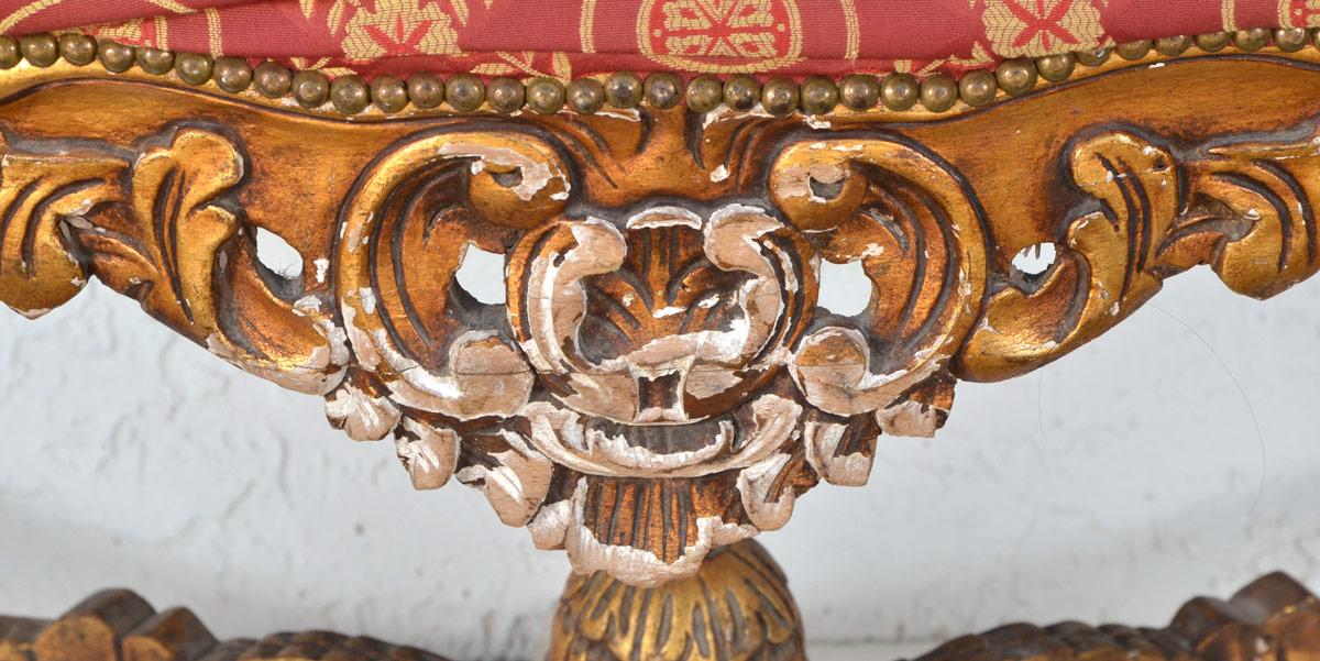 ITALIAN STYLE GOLD GILT OVERSIZED BENCH: A most unusual large carved and gilt wood frame with a tacked upholstered top. 27 1/2'' h. x 44'' x 27''.