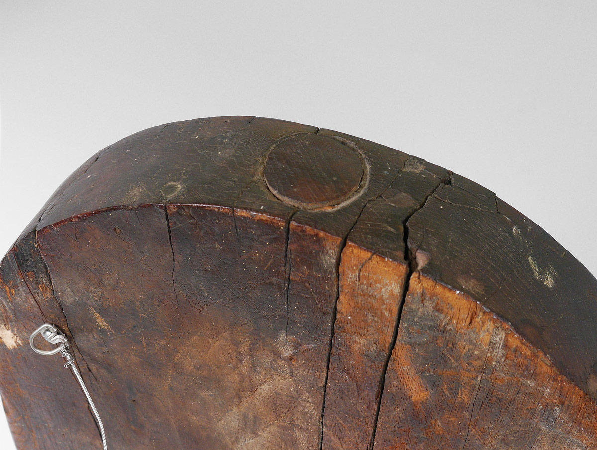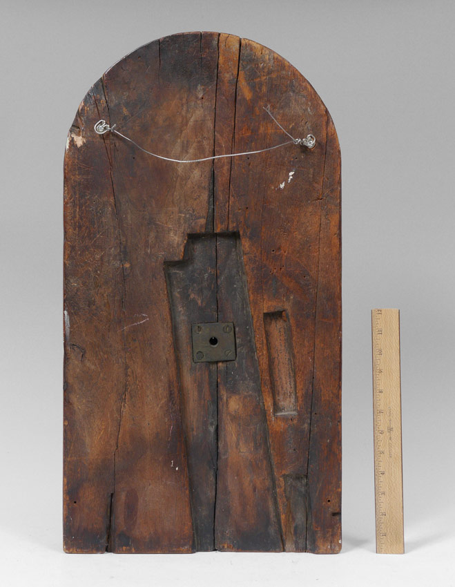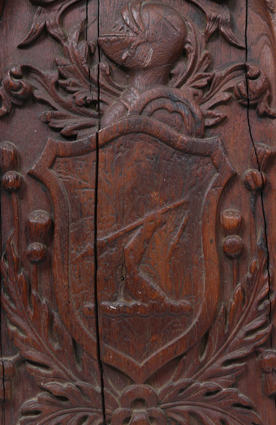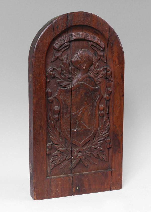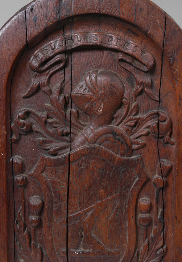 SCOTTISH CARMICHAEL CLAN ARMORIAL CREST CARVED WOOD PANEL: Carved with motto ''Toujours Prest'' (Always Ready), knight head over shield with bent arm holding a broken spear, and thistles. Back has cut out for mounting? Overall measures 26'' h. x 13 3/4'' x 2 1/2''.