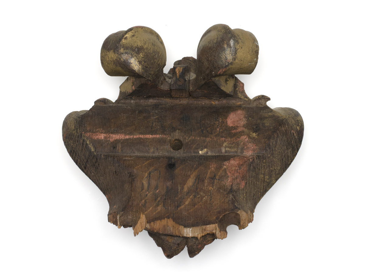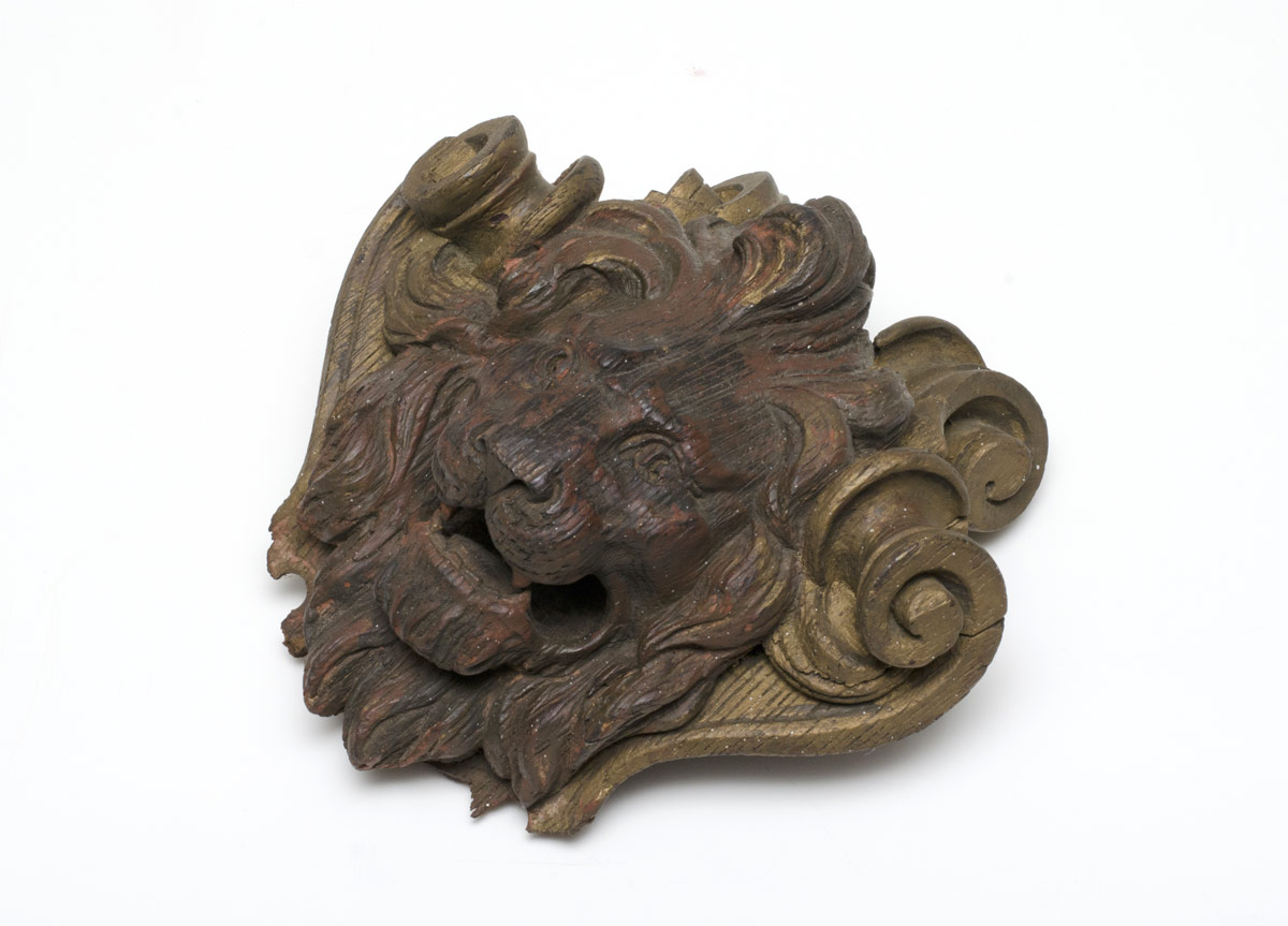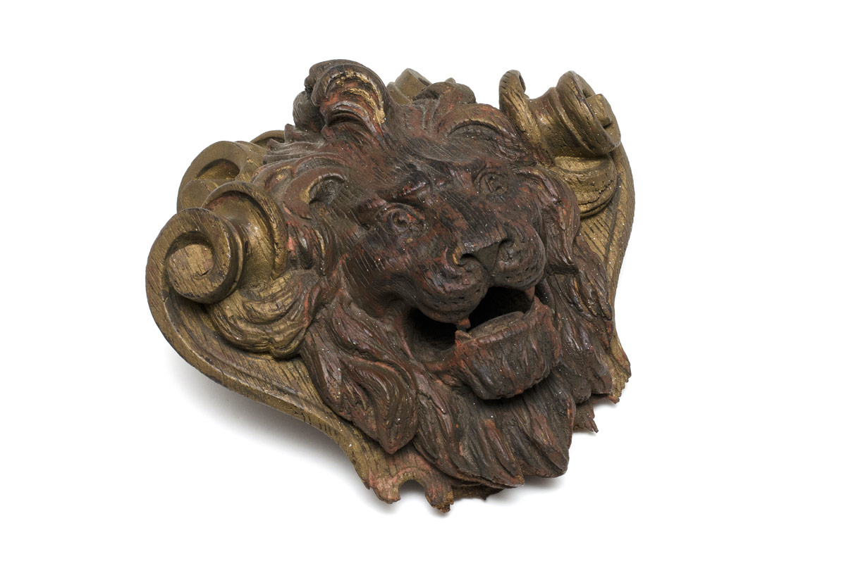 CARVED ARCHITECTURAL LION MASQUERON: Traces of gold and red paint. Measures 10 1/2'' h. x 11 1/2'' x 4 5/8''.
