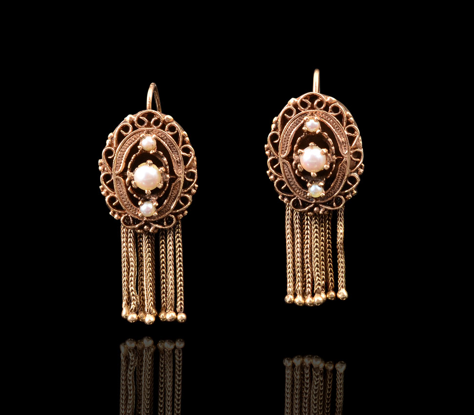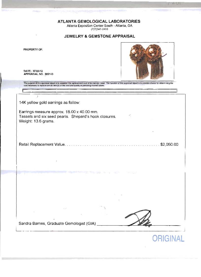 14K GOLD VICTORIAN TASSEL AND SEED PEARL EARRINGS: 14K yellow gold earrings with seed pearls and tassels. Shepard hook closures. Length 1.5''. Weight 13.6 grams. Sold with current Atlanta Gemological GIA graduate's appraisal for $2,050.