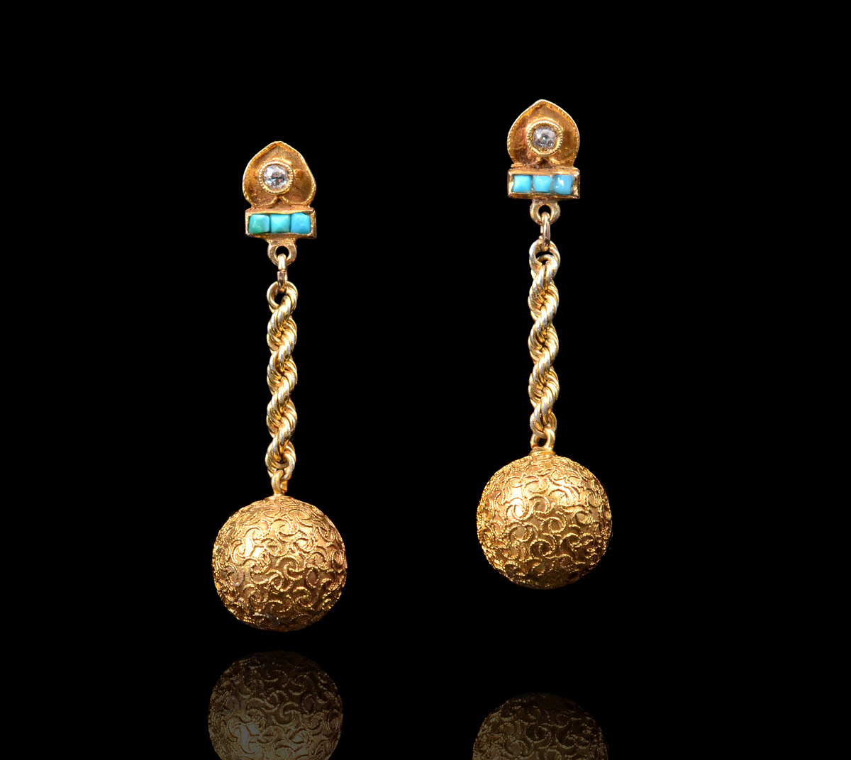 18K ART DECO ETRUSCAN REVIVAL DROP EARRINGS: Yellow gold with diamonds and turquoise. Post and nut closure. Length: 1 3/8''. Weight: 3.6 grams.