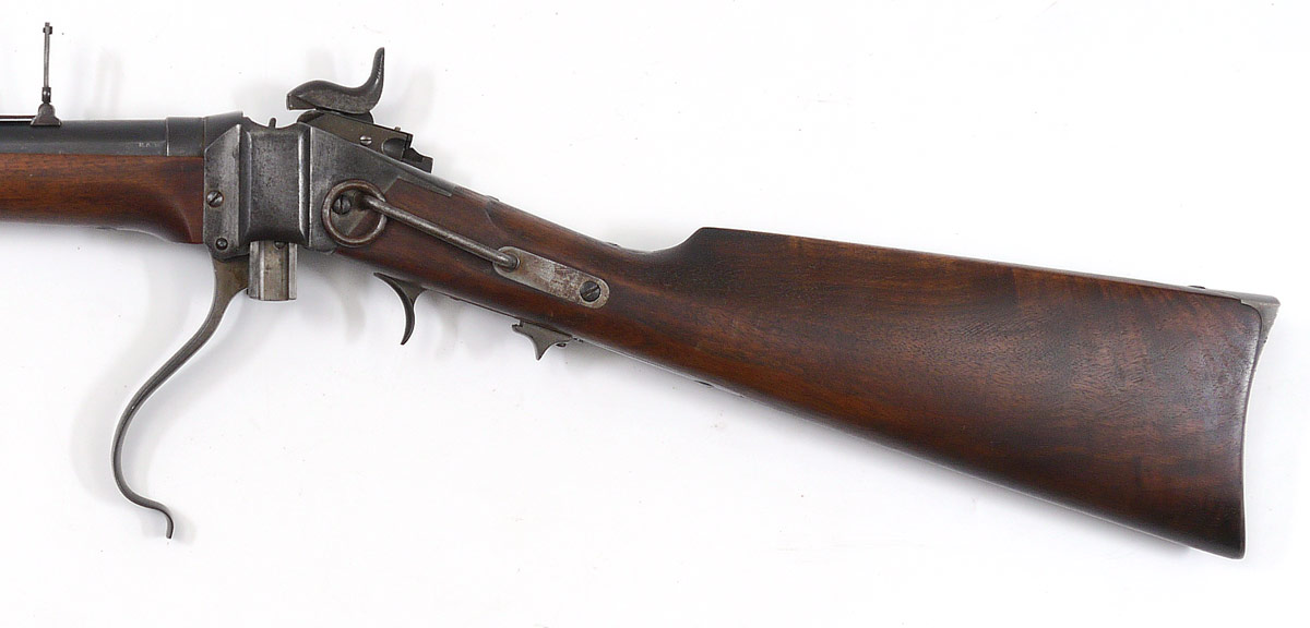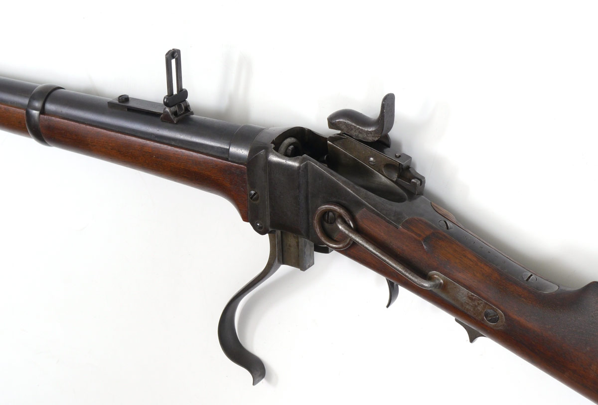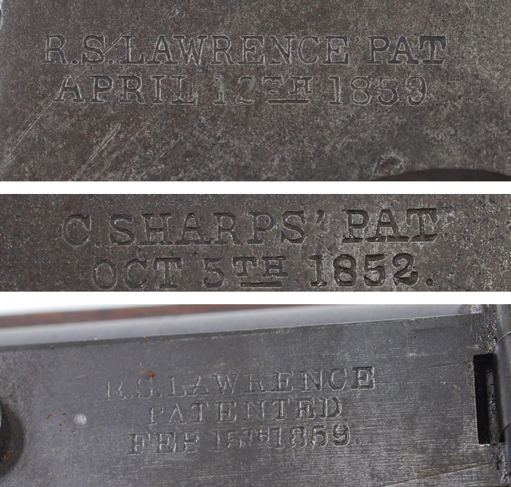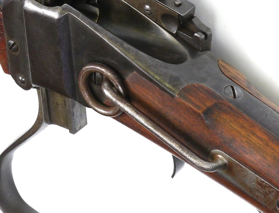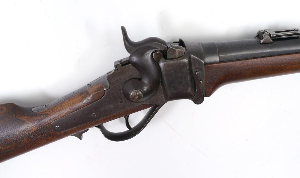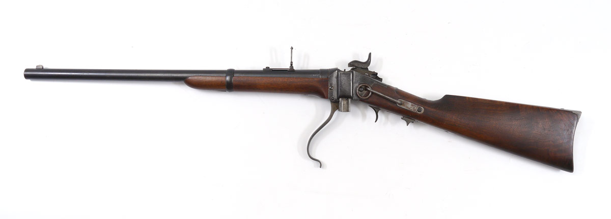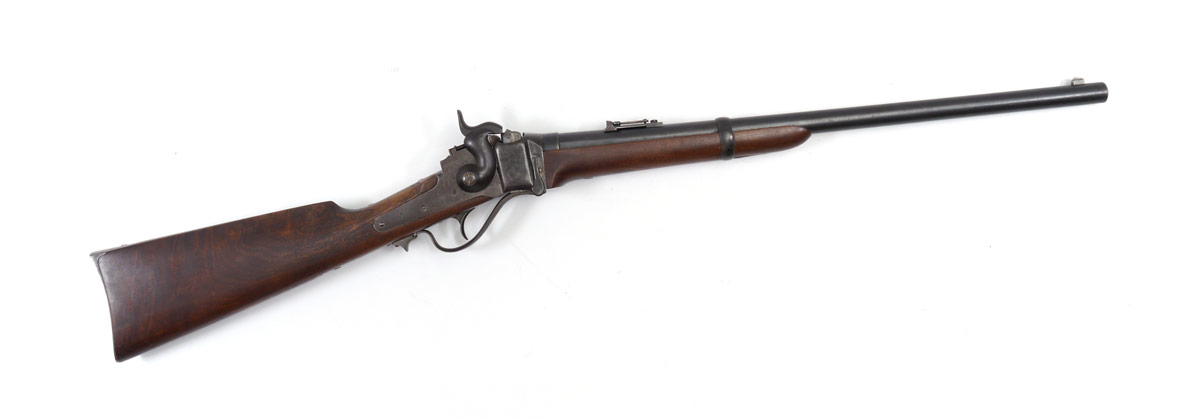 SHARPS 1863 NEW MODEL SADDLE RING CARBINE: Serial number C, 16703. Typical Sharps and Lawrence patent stamping right side receiver, Sharps 1848 patent left side. Trace of stamp top of 22'' barrel, E.A.W. and J, left side barrel. No inspector cartouche on walnut stock. Action nice and tight, works. Overall measures 39''.