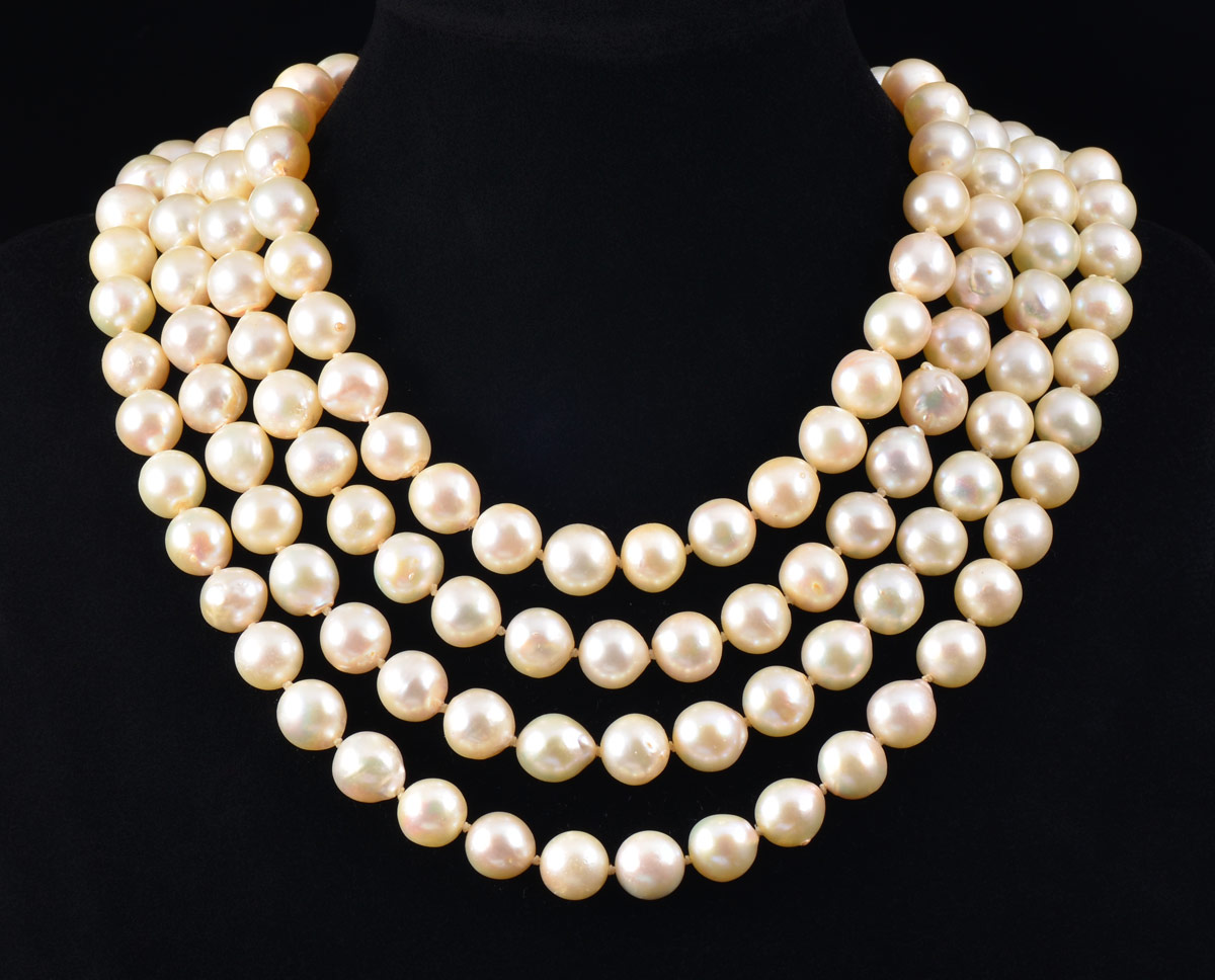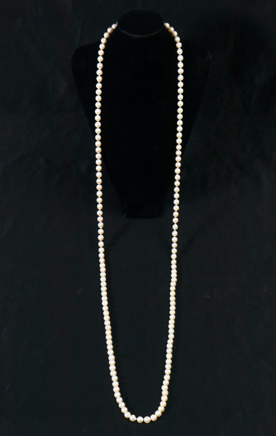 62'' STRAND OF CULTURED PEARLS: 62'' strand necklace of 8.50-9.00 mm freshwater cultured pearls. Dark cream in color, slightly baroque shaped, blemished. Low luster.