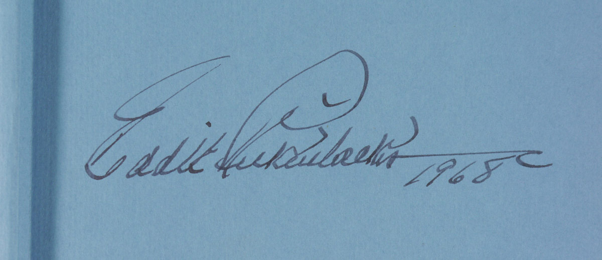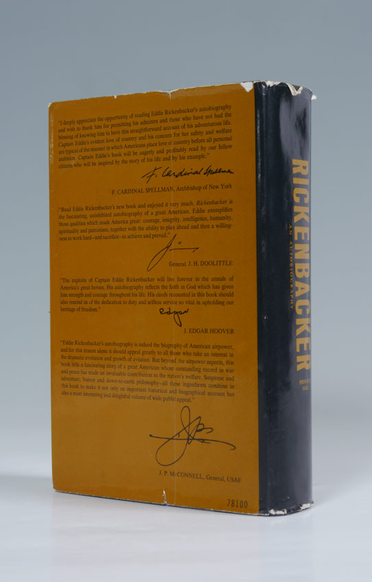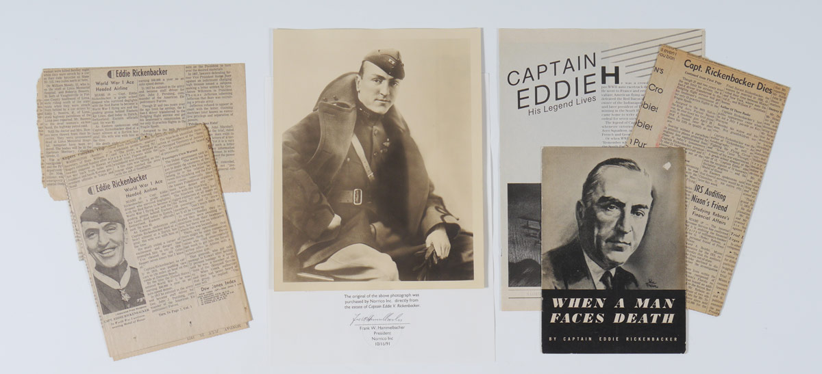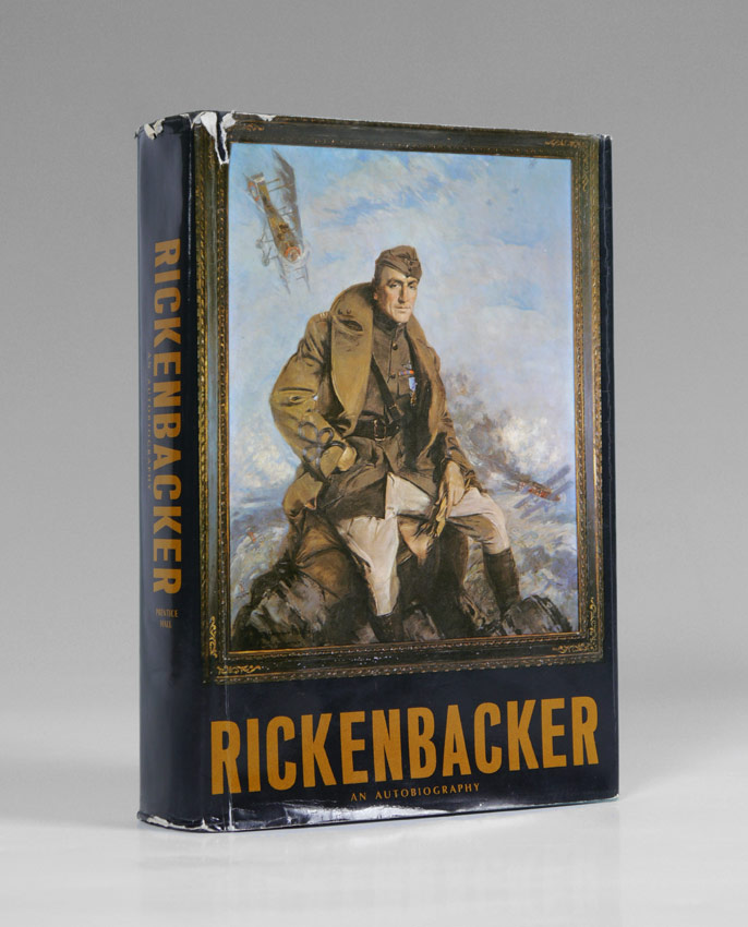 EDDIE RICKENBACKER SIGNED AUTOBIOGRAPHY BOOK: WWII hero Major E. V. ''Eddie'' Rickenbacker autographed copy of his book ''Rickenbacker'', published 1968. Sold with photograph, newspaper clippings, and booklet.