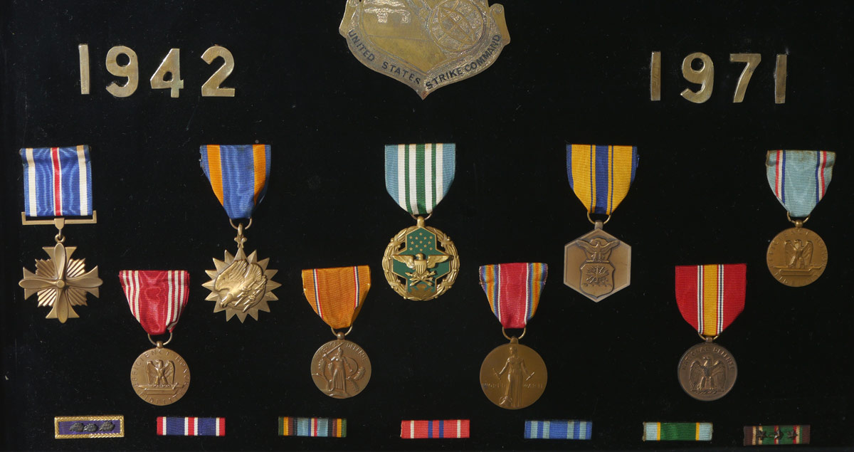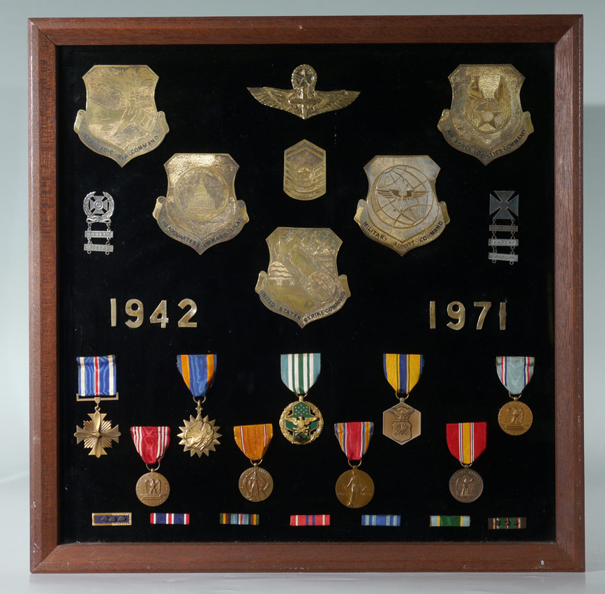 FRAMED COLLECTION OF US AIR FORCE MEDALS: Spanning a lifetime service in the Army and Air Force 1942-1971, medals to include Distinguished Flying Cross, Army Good Conduct medal, Army Air medal, American Defense medal, Joint Service Commendation medal, WWII Victory medal, Air Force Commendation medal, National Defense medal, Air Force Good Conduct medal. Also in frame 5 command plaques, Strategic Air, Headquarters Command, United States Strike, Military Airlift, and Air Force Logistics. Senior Master Sergeant plaque and 2 ladder badges. 20'' x 20''.