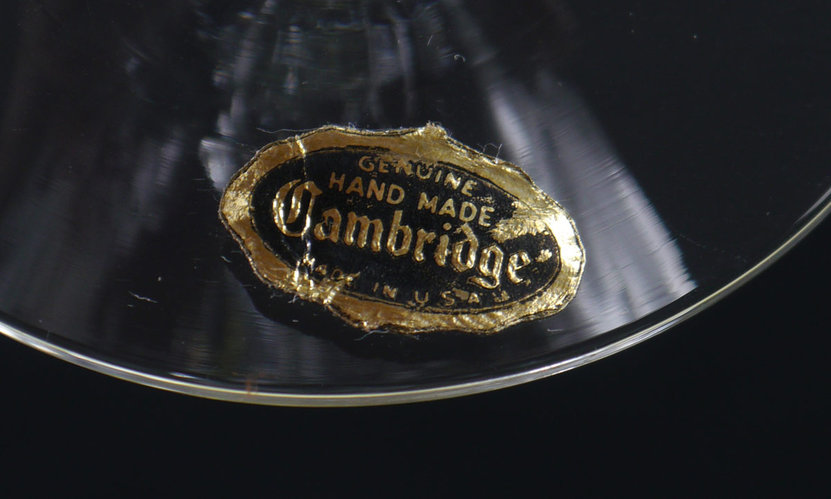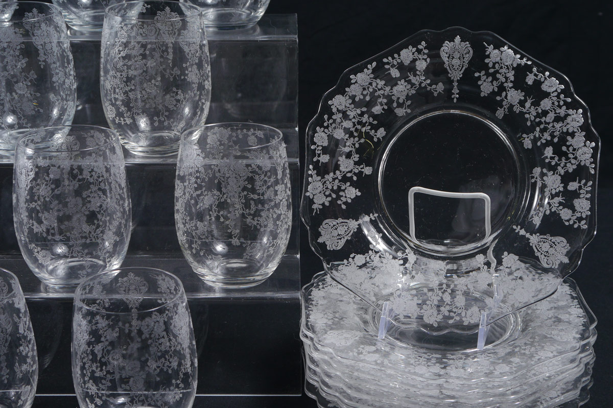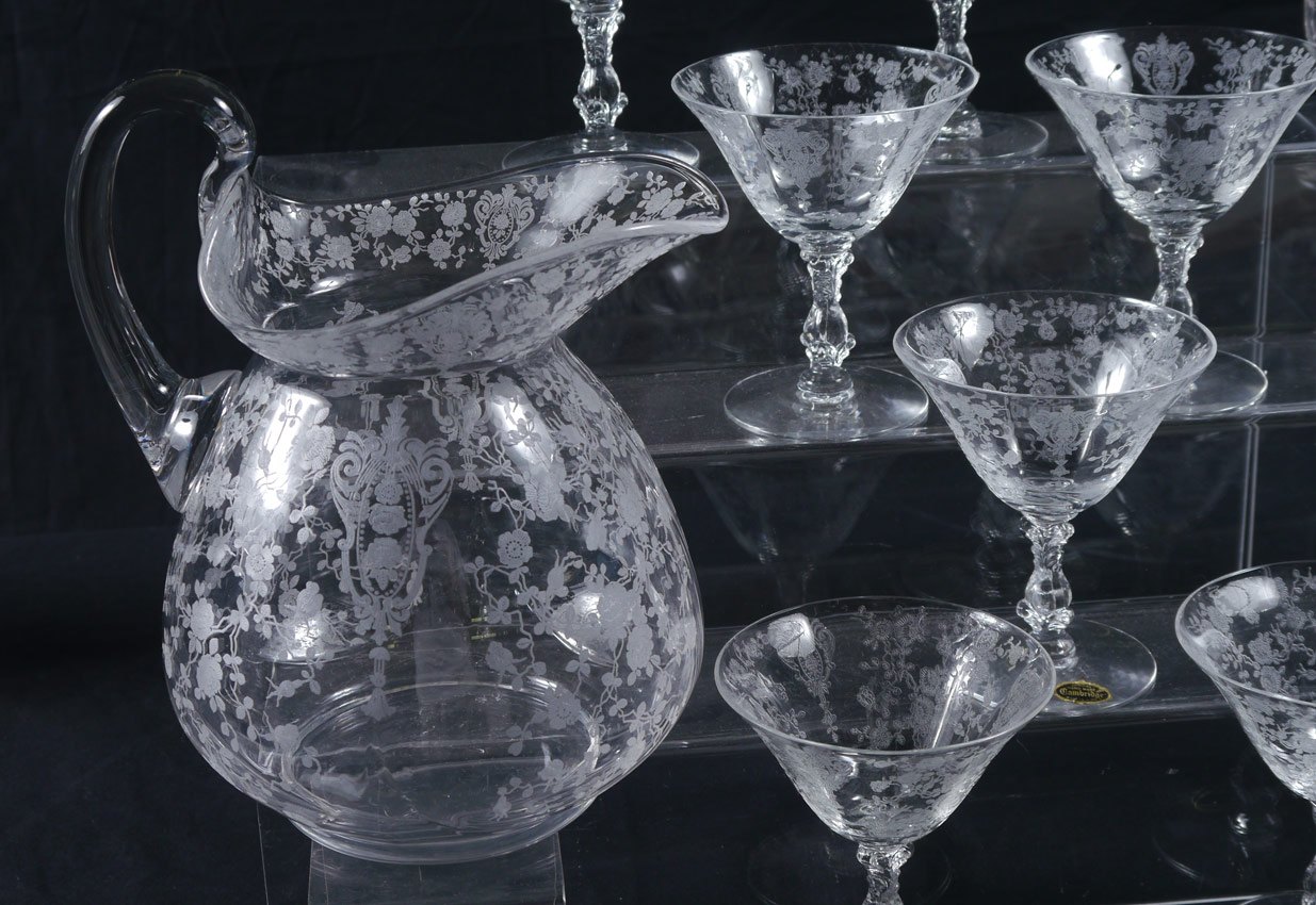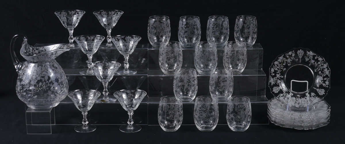 28 PIECE CAMBRIDGE ROSE POINT ETCHED GLASSWARE: 28 pieces in the Rose Point pattern by Cambridge to include Doulton pitcher (8'' h. x 7 3/4''), 12 belled tumblers (4 1/4'' h.), 8 salad plates (8 1/4''), 7 low sherbet or martini (4 3/4'').