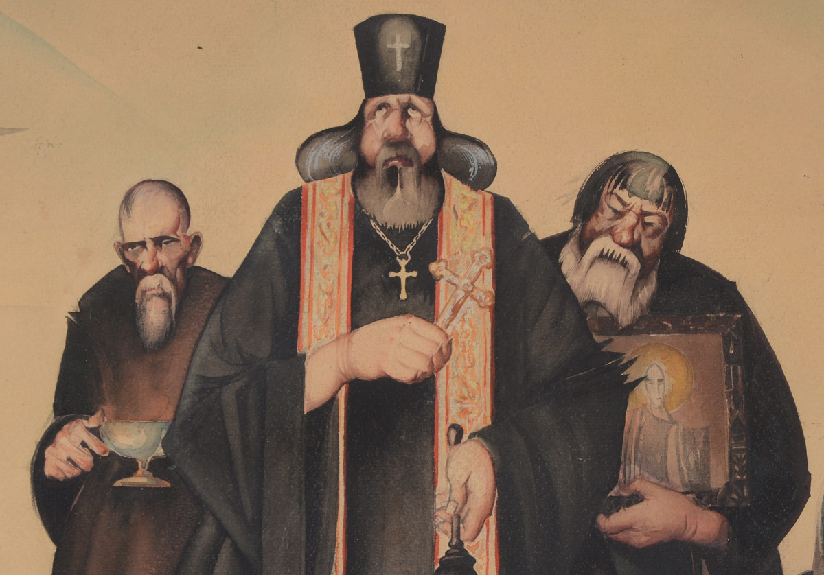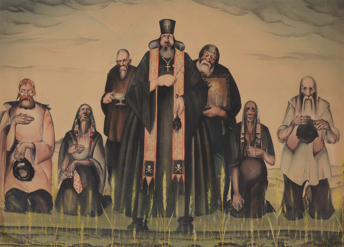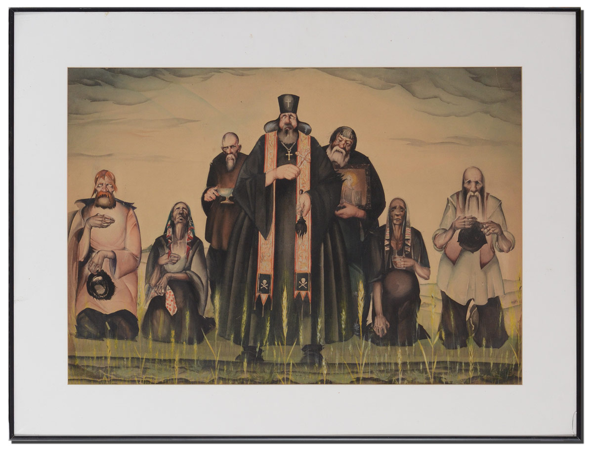 MULLER, Paul, (American, 1895-1970): ''Praying for Rain'', Depicts a Solemn Group of Weary Farmers with Priest Praying for Rain, Watercolor, Sight size 19 1/2'' x 27 1/2'', no visible signature, unframed, mounted to an acid free backboard, 27'' x 35'', Cyrillic signature lower right.