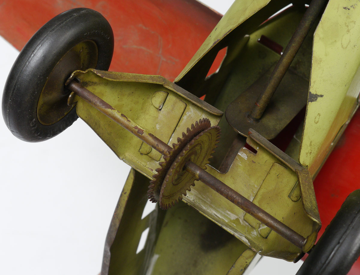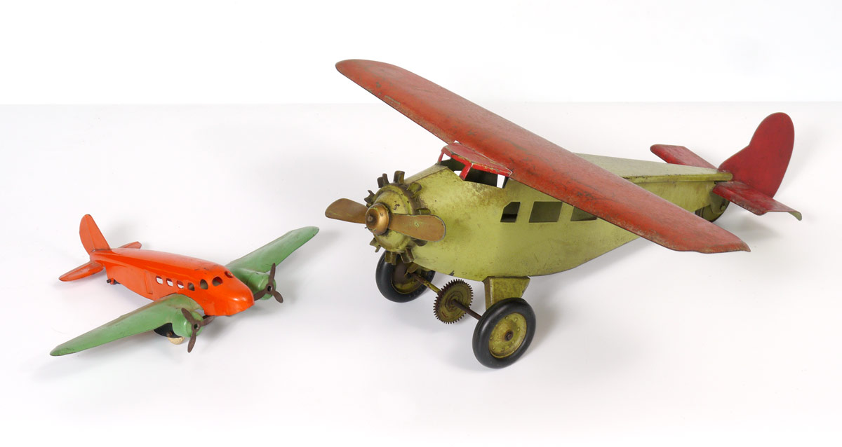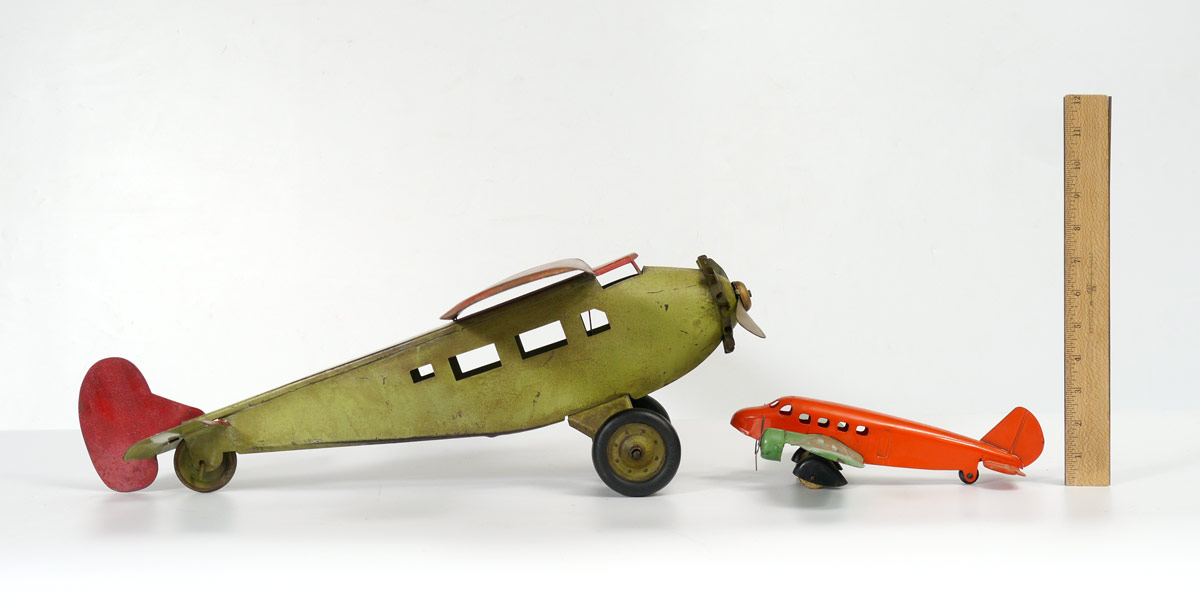 2 PRESSED STEEL TOY AIRPLANES: To include 1) Pre-war Turner Toys single engine prop plane. Hard rubber front wheels marked Turner Toys. 7 1/2'' h. x 20 3/4'' x 20'' wingspan. Appears to be all original. 2) Wyandotte twin engine plane, white rubber front wheels, 2 3/4'' h. x 9 1/4'' x 12 3/4'' wingspan. All original.