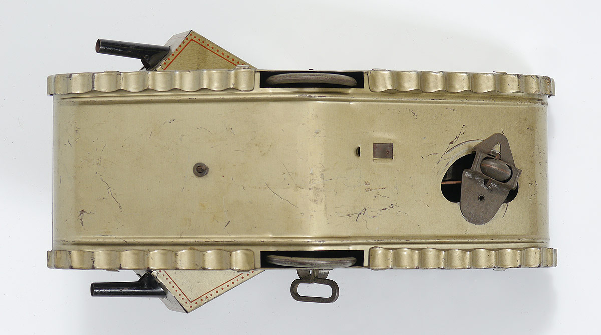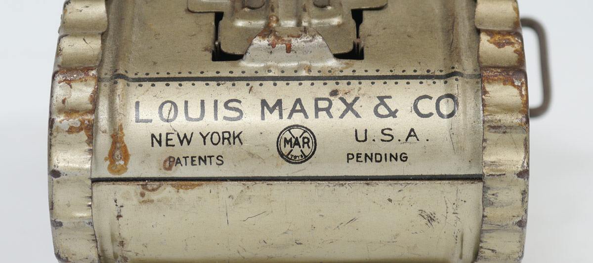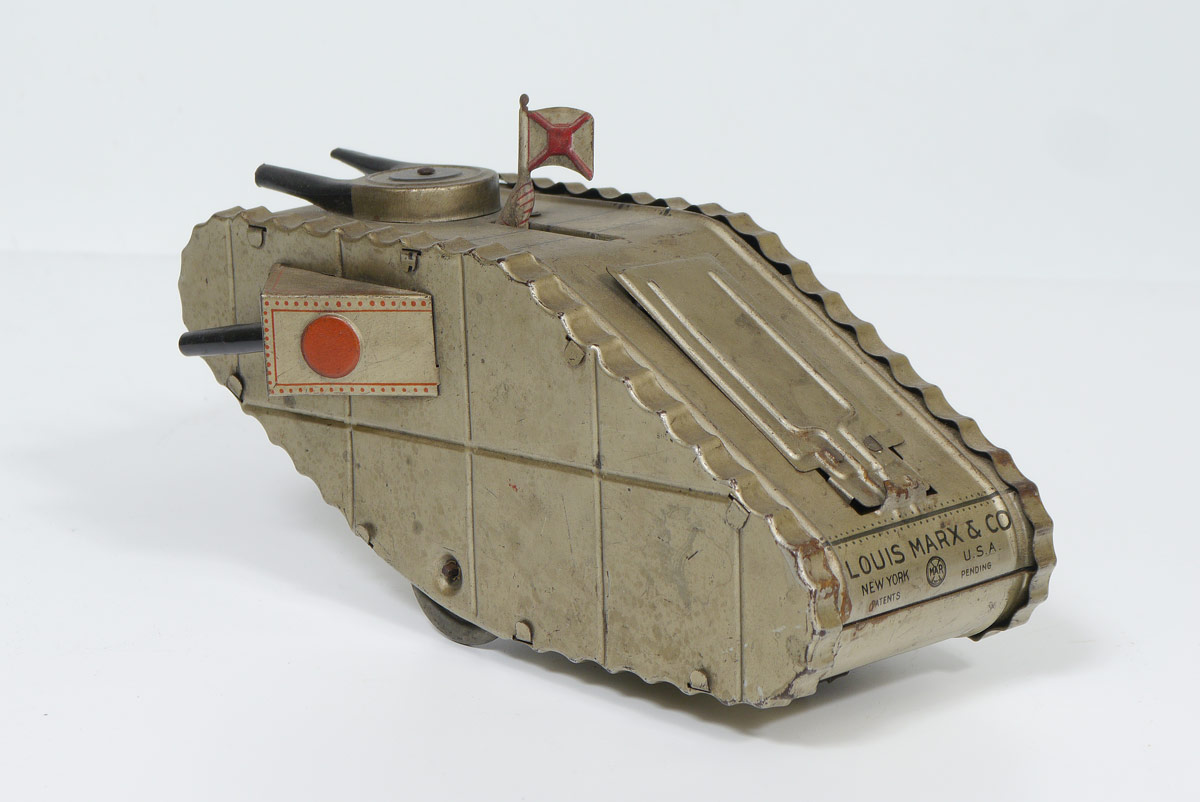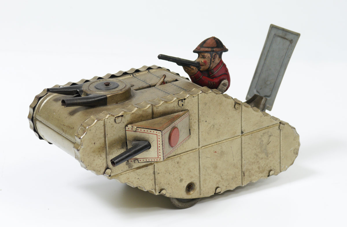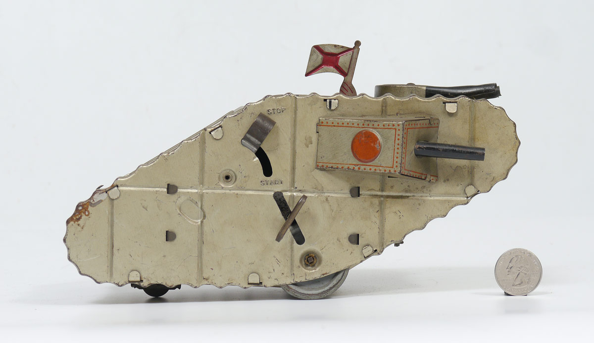 MARX DOUGHBOY TIN LITHOGRAPH TOY TANK: Circa 1930's wind up tank by Louis Marx with pop out doughboy. Measures 4 1/2'' h. x 9 1/4'' x 5''.