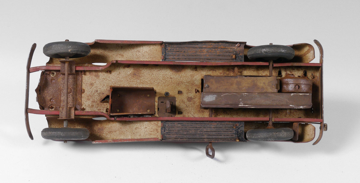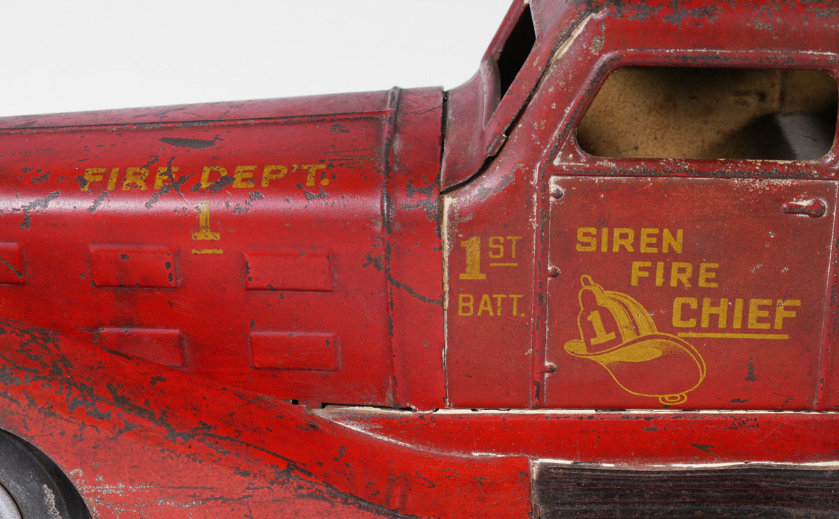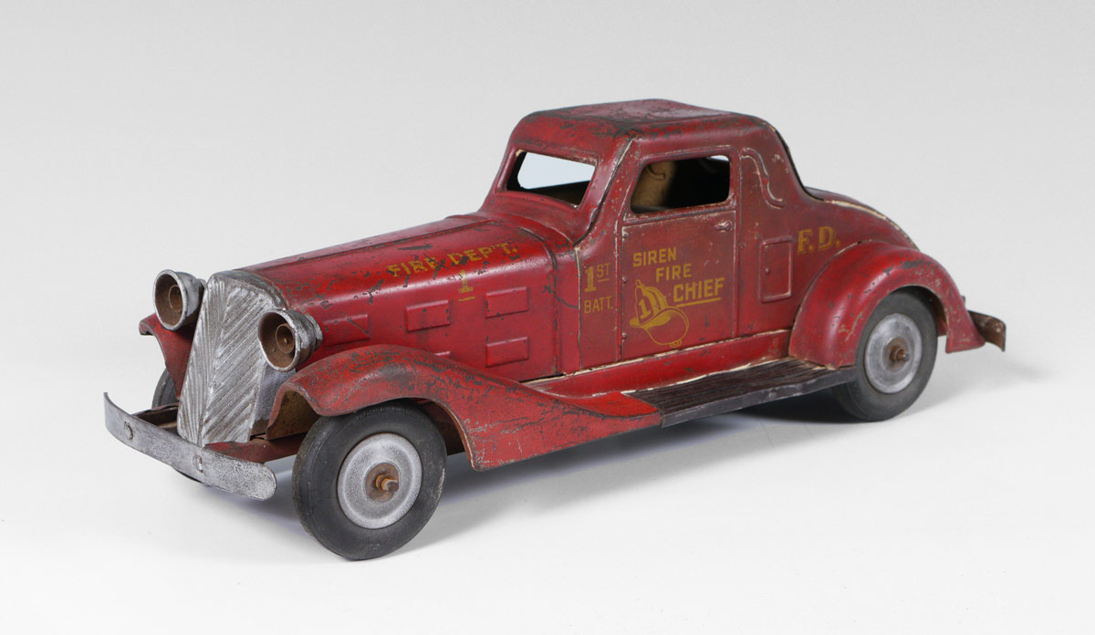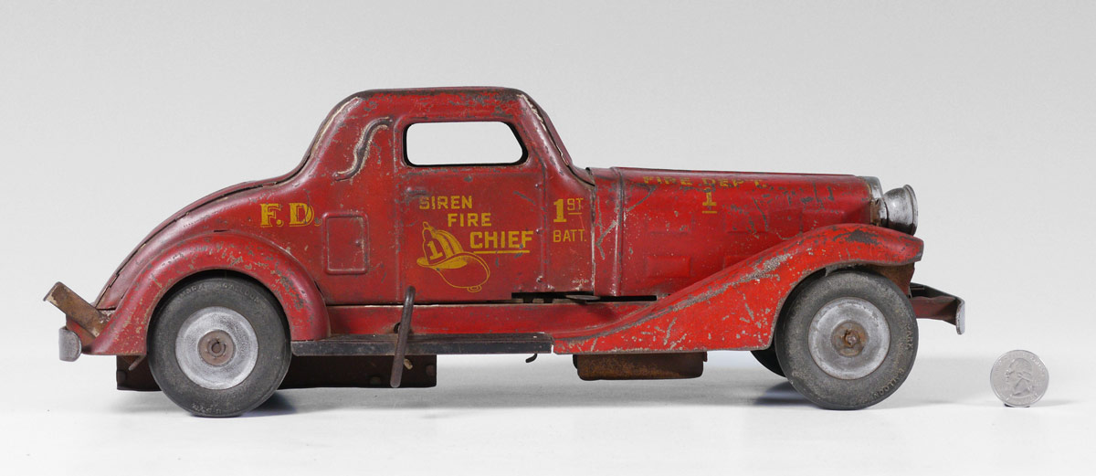 MARX SIREN FIRE CHIEF PRESSED STEEL TOY CAR: Key wind coupe, original paint, 1st Batt. Siren Fire Chief, marked Louis Marx Co. NY. Currently not working. 5 1/2'' h. x 15'' x 5 3/4''.