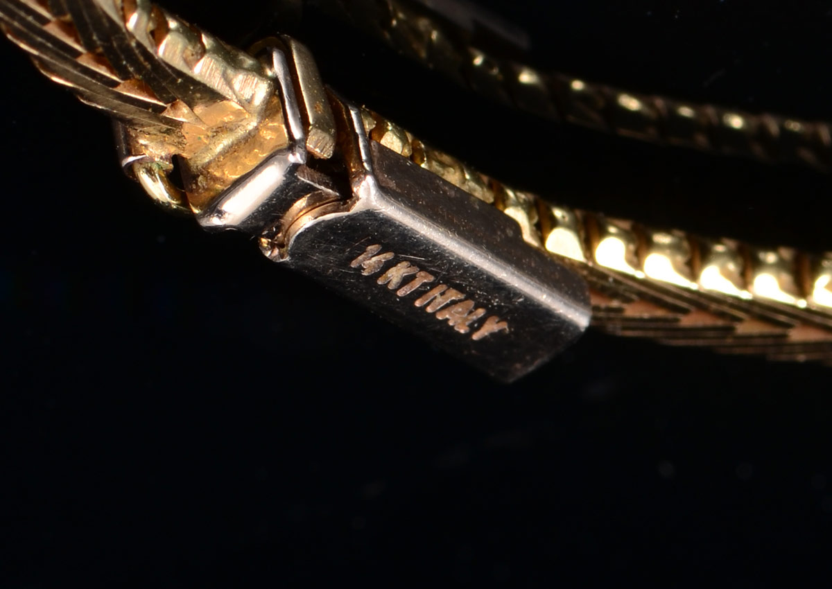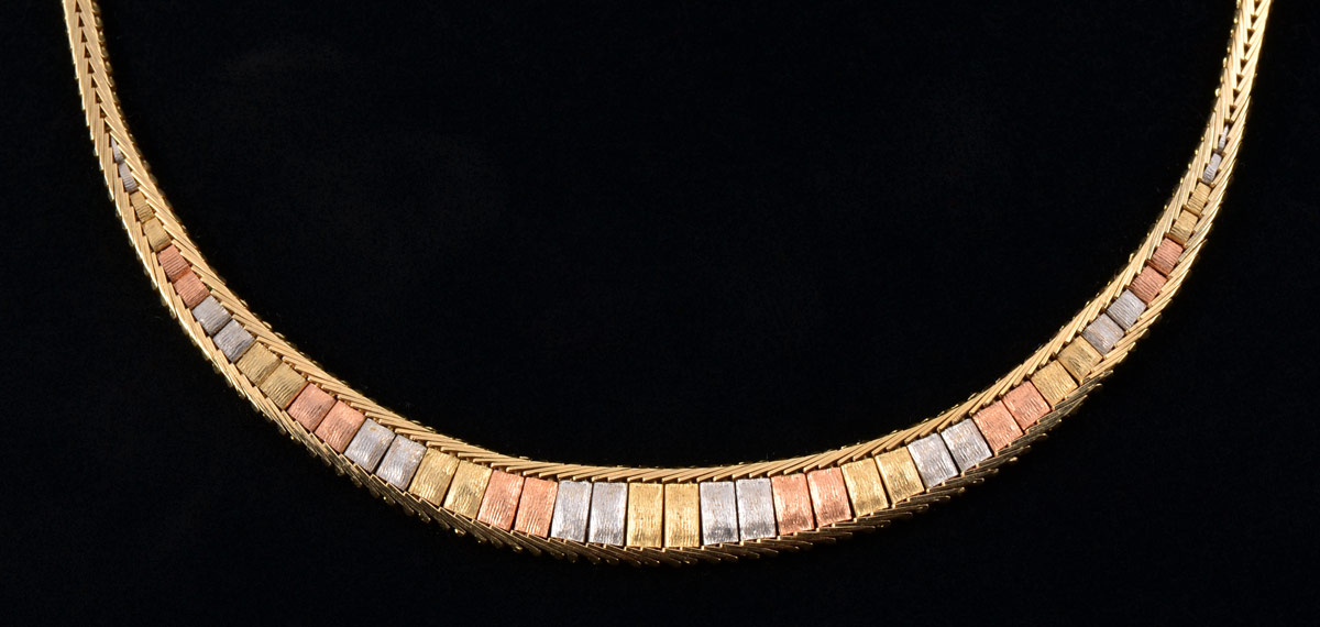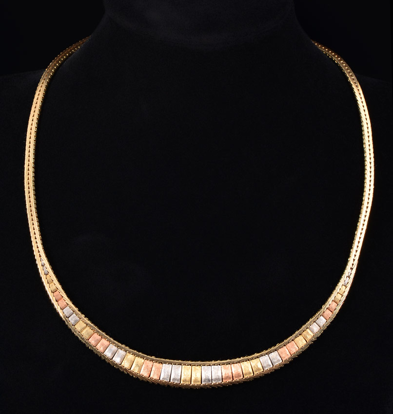 ITALIAN 14K GOLD NECKLACE: Multi-toned panel design, marked 14k Italy. Approx. 15 3/4'' long, 25.8 grams.