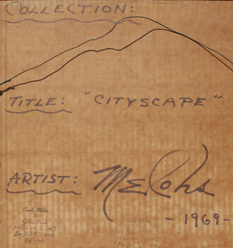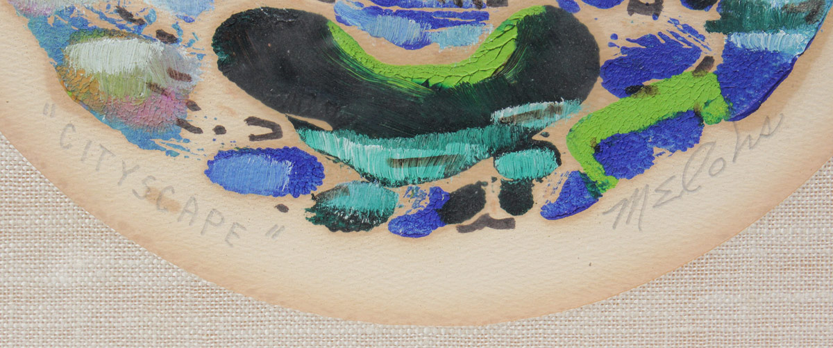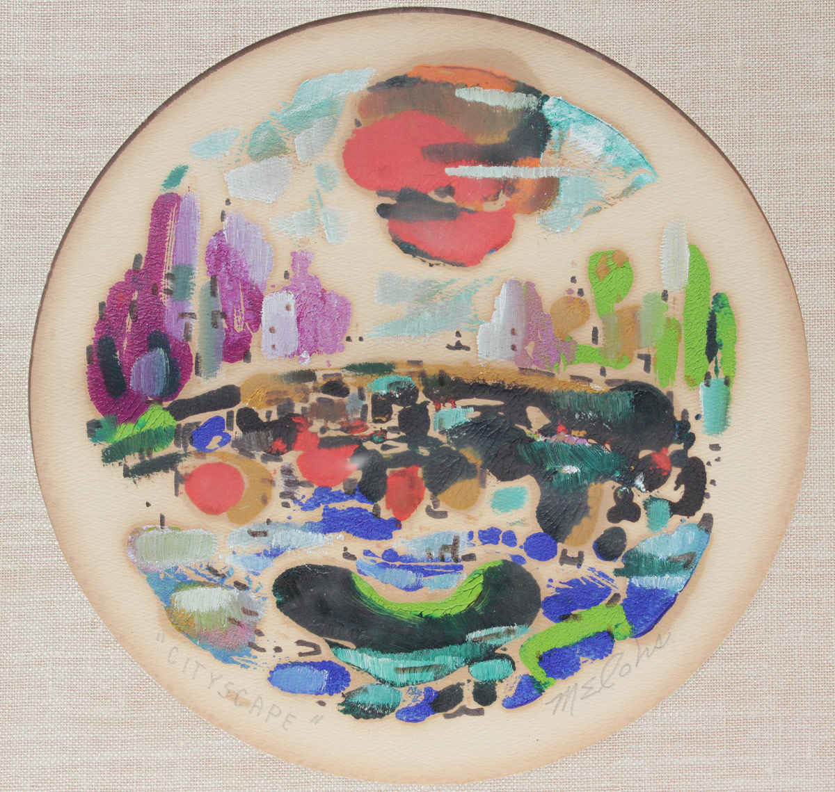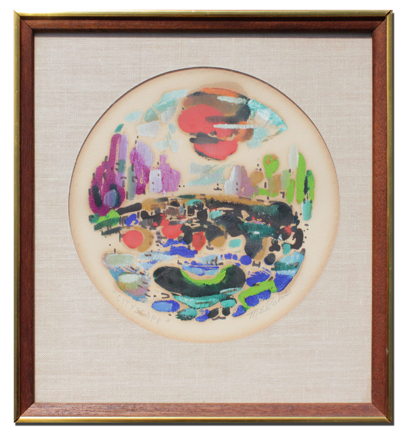 MELOHS, Charles, (American, 1908-1982): ''Cityscape'', Oil/Paper, Circular 9'' diameter, with margins 11'', pencil signed lower right, titled lower left, signed, titled and dated 1969 verso, framed 16 1/4'' x 15 1/4''.