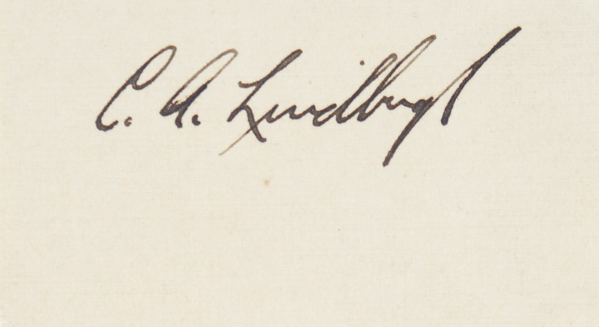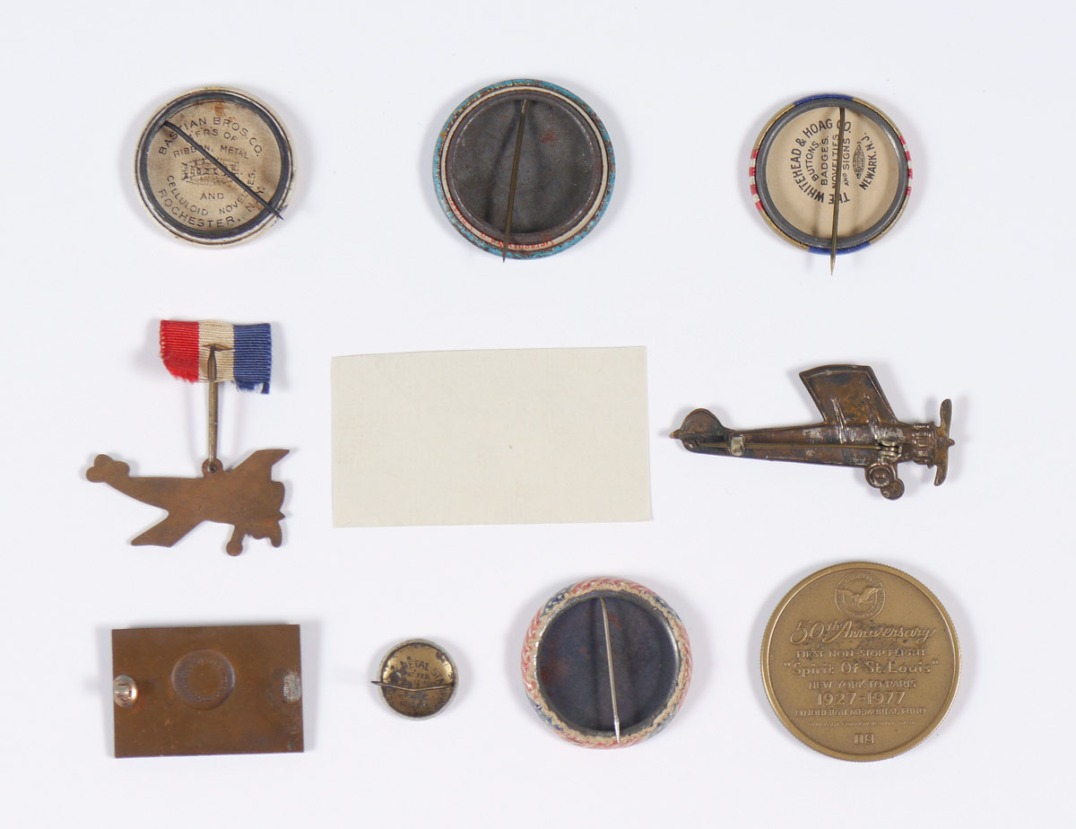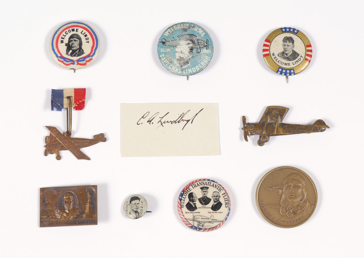 CHARLES LINDBERGH AUTOGRAPH & PINS: 10 pieces to include 1) Clip signature. 2) Bastain Brothers ''Welcome Lindy'' pin-back. 3) Geraghty & Co. ''Welcome Home Slim Lindy'' pin-back. 4) Whitehead & Hoag ''Welcome Lindy'' pin-back. 5) Spirit of St. Louis figural pin. 6) 50th Anniversary bronze token. 7) Greenburg ''Lucky Lindy'' miniature pin-back. 8) Whitehead & Hoag bronze ''First Flight'' pin, missing shaft. 9) Spirit of St. Louis figural badge with partial ribbon. 10) ''Bremen'' Transatlantic pin-back.