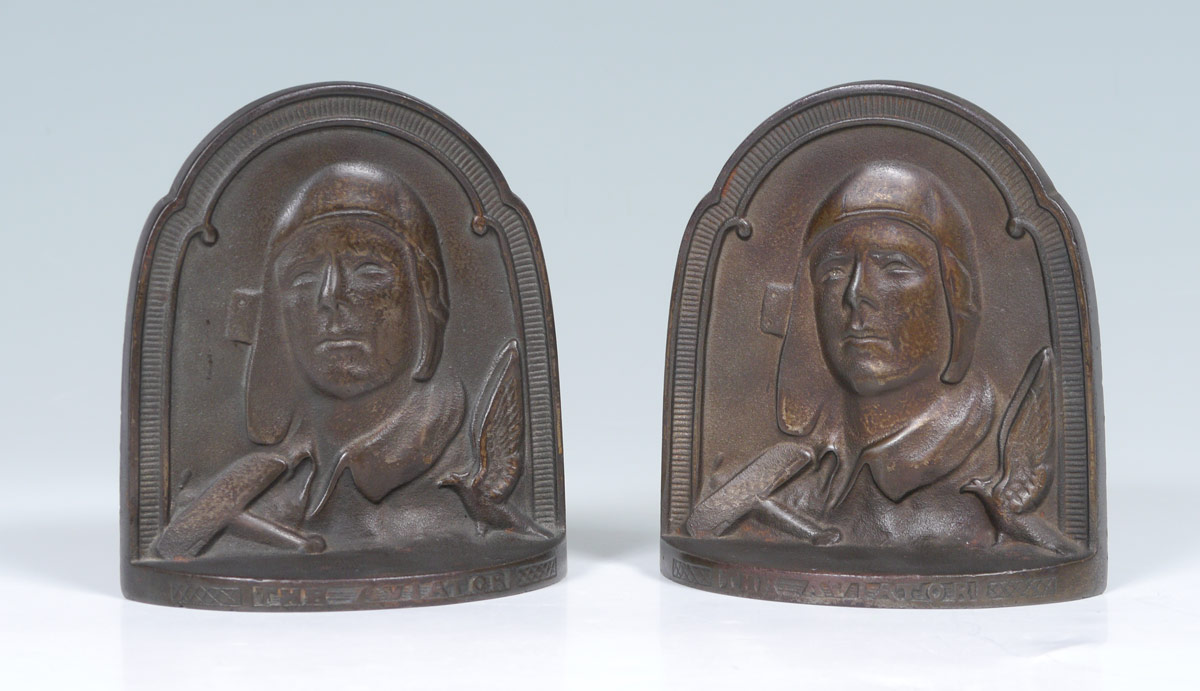 PAIR 1929 CHARLES LINDBERGH THE AVIATOR BOOKENDS: Bronzed cast metal, measure 5 1/2'' h. x 5'' x 2''.