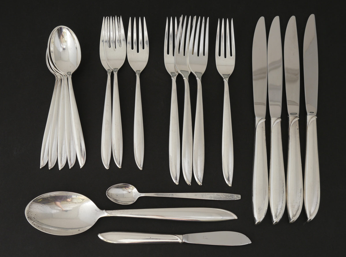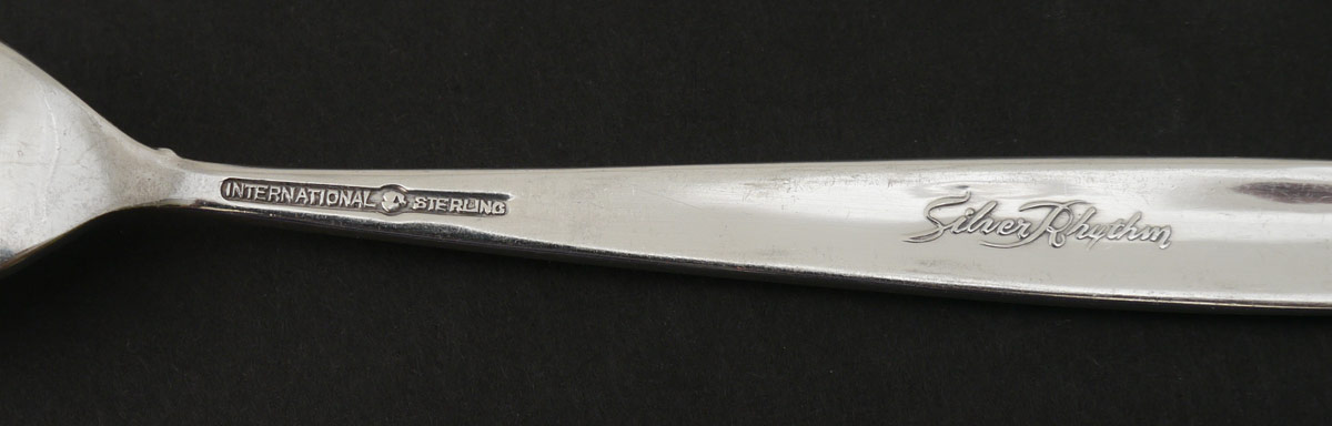INTERNATIONAL STERLING SILVER RHYTHM FLATWARE: 18 pieces in the Silver Rhythm pattern by International to include 4 forks (7 1/4''), 3 salad forks (6 5/8''), 5 teaspoons (6''), 4 hollow knives (9 1/8''), hollow butter knife (6 1/4''), tablespoon (8 1/2''). Sold with a Towle sterling spoon (5 1/2''). Approx. 24.9 troy oz.