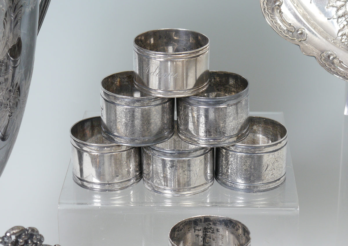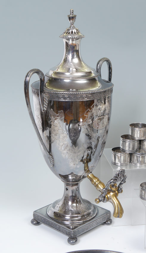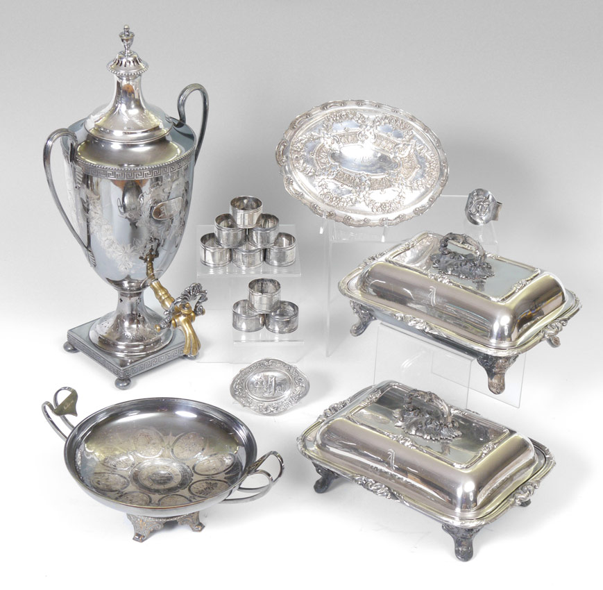 ADAMS COLLECTION OF SILVERPLATE TABLE ACCESSORIES: From the estate of Listed Artist, Waldo Kennard, direct descendant of shipping magnate Alvin Adams: Approx. pieces to include 1) Samovar with engraved and embossed decoration, monogrammed AA. 21'' h. x 11 1/2''. 2-3) Pair James Dixon & Son Sheffield covered vegetables, monogrammed A. 7'' h. x 12 1/4'' x 9 1/4''. 4) Engraved handled tazza, monogrammed JHA and dated March 25, 1867. 5 1/2'' x 13 1/4''. 5) Embossed tray, monogrammed AS, dated Jun, 23 1903. 6) Small embossed dish with Dutch scene. 7-16) 10 Assorted napkin rings with assorted monograms and names.