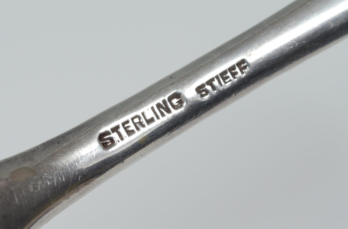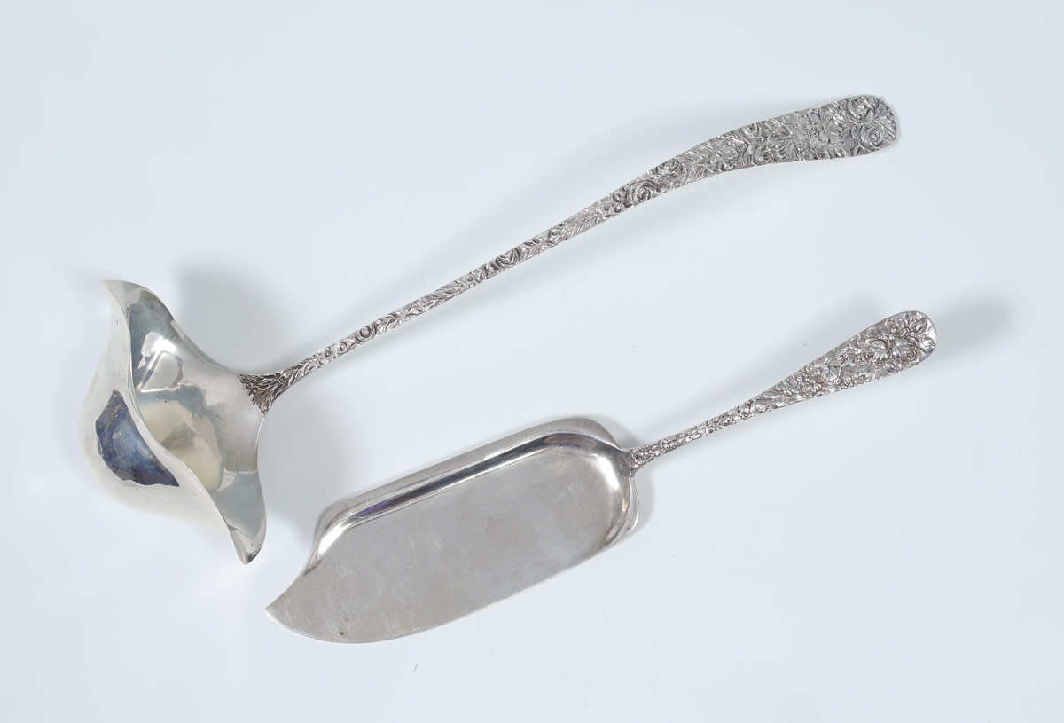 2 PIECE STIEFF STERLING REPOUSSE LADLE & FISH KNIFE: 2 pieces in a repousse floral design to include 1) Fish serving knife marked Stieff Sterling, 12'' long. 2) Punch ladle marked only Sterling, similar to the Stieff pattern, 15'' long. Approx. 12.7 troy oz.