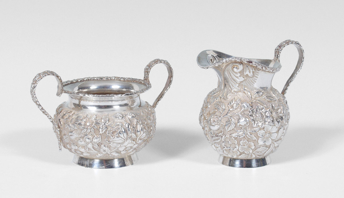 STIEFF REPOUSSE FLORAL OPEN CREAM & SUGAR: Repousse floral motif open creamer and sugar marked Stieff Sterling, #26. Creamer 3 7/8'' x 3 7/8'', open creamer 3 1/8'' x 5 1/8''. Approx. 9.3 troy oz.