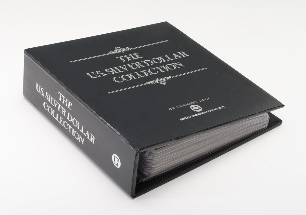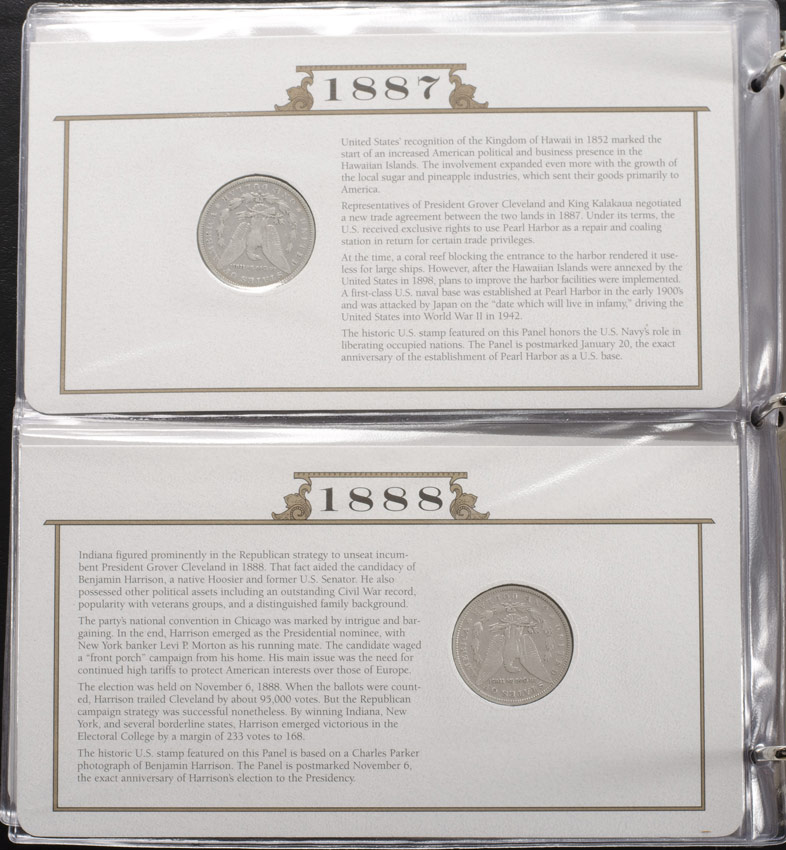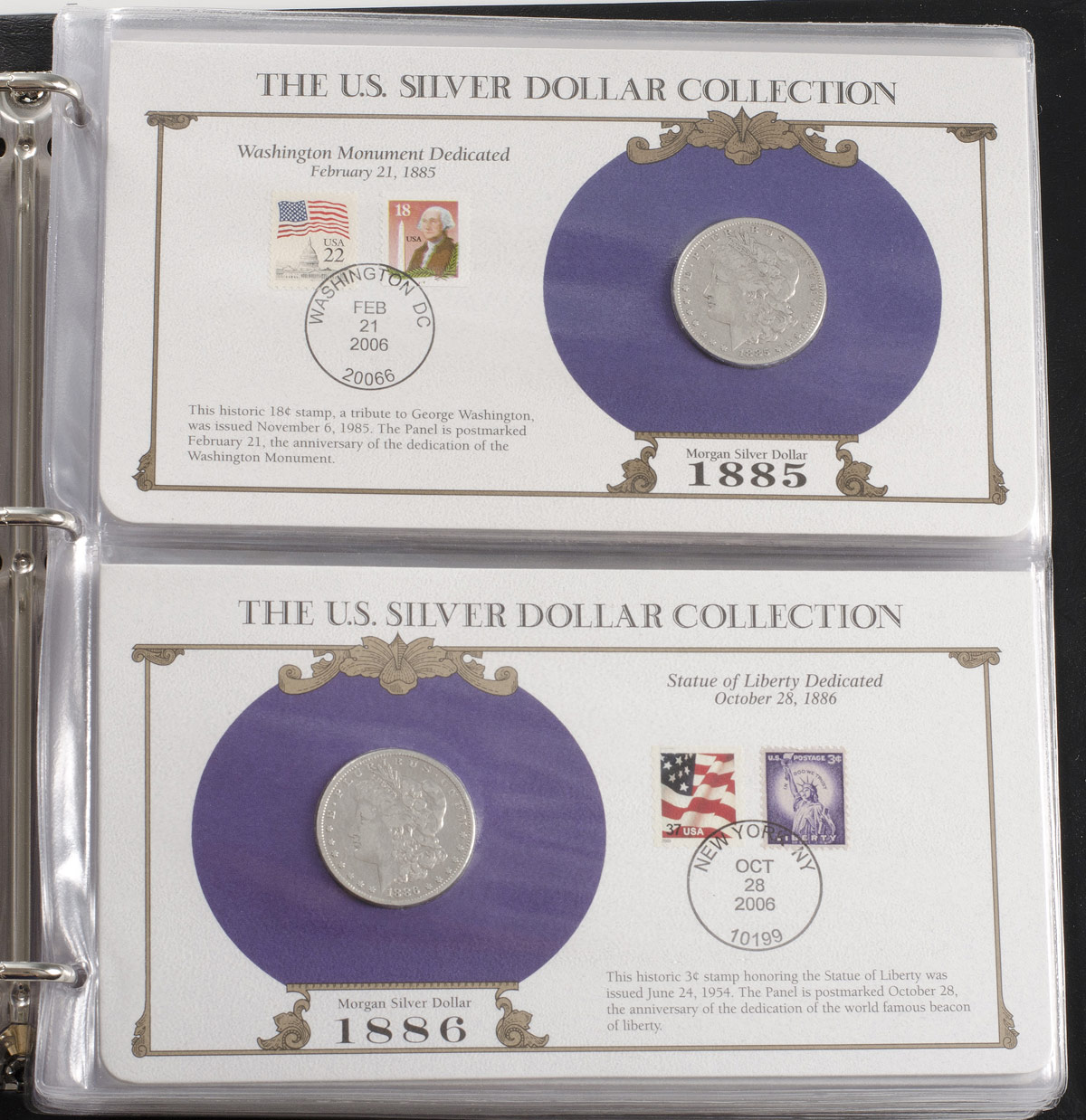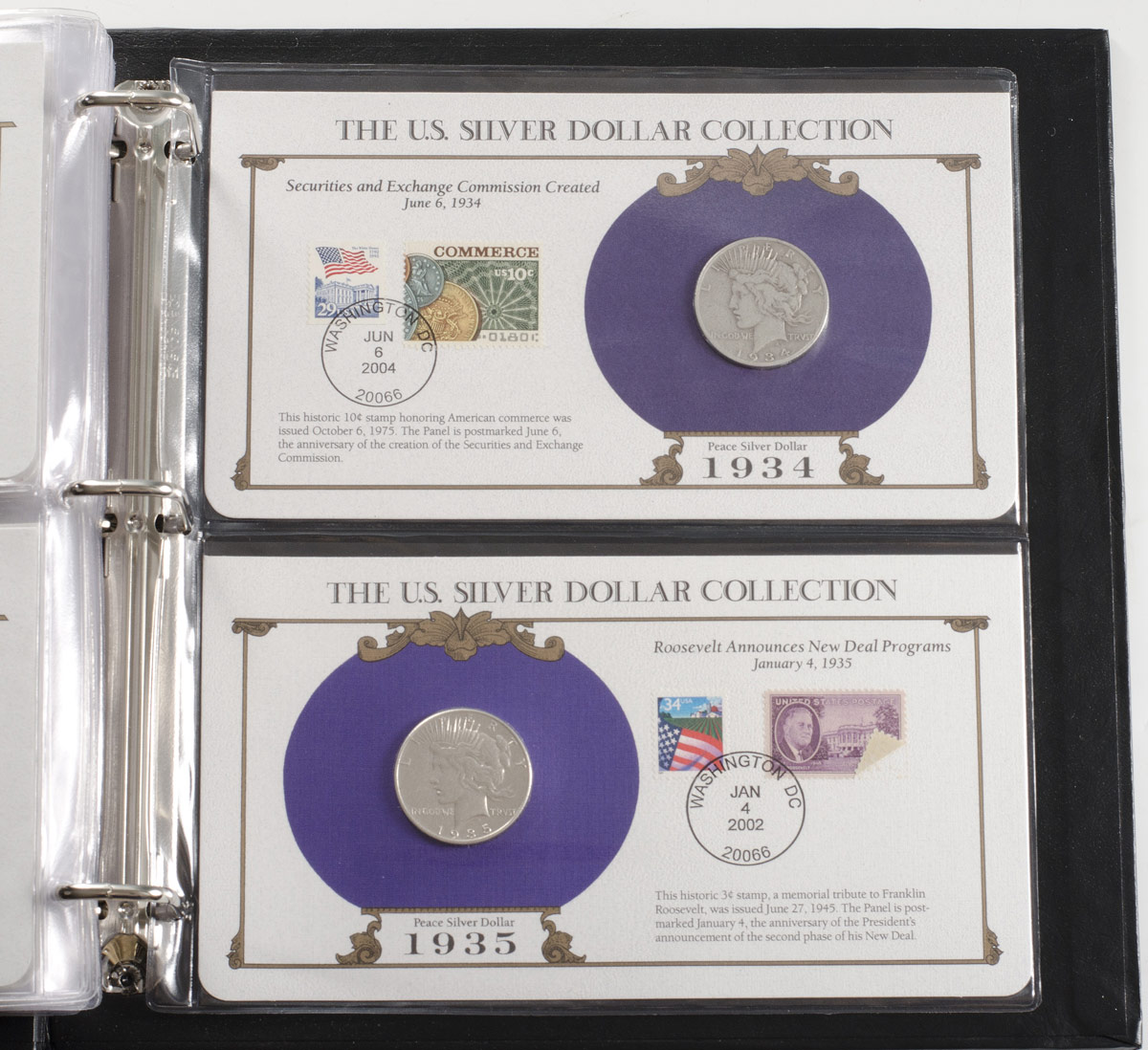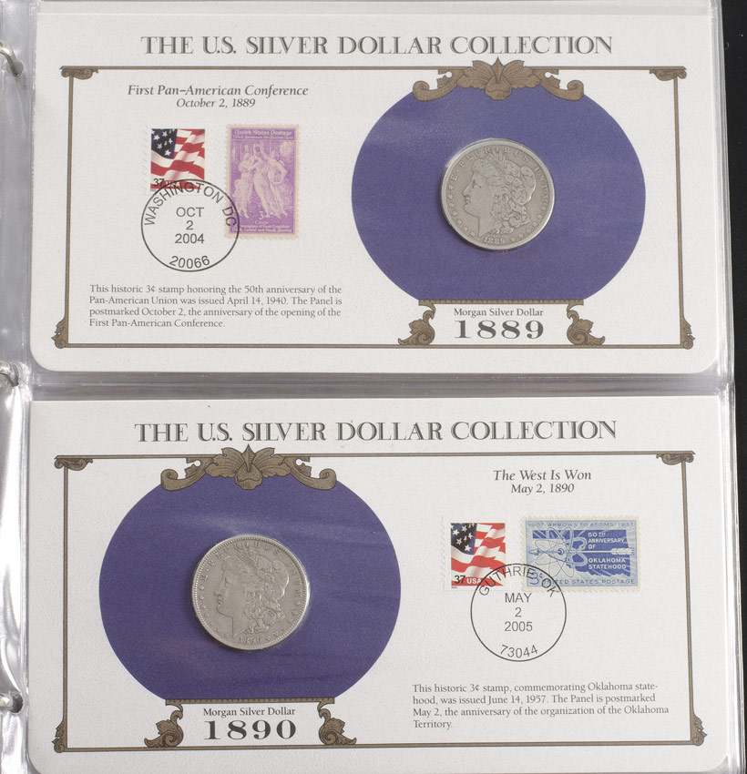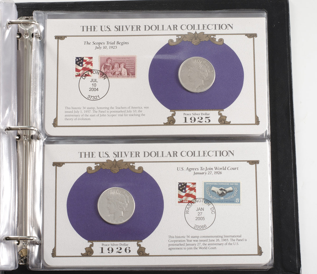 US SILVER DOLLAR COLLECTION IN BINDER: Contains 35 US silver dollars to include Morgan dollars 1878-1892, 1894, 1896-1904. Peace dollars 1921-1928, 1934, 1935. Each dollar with stamped card commemorating an event of that year. Produced by the Postal Commemorative Society. Binder measures 3 1/2'' h. x 11 1/2'' x 12''.