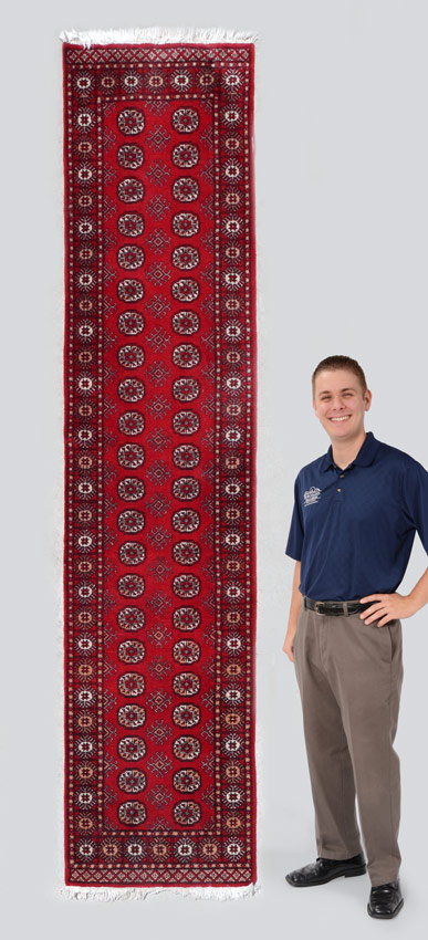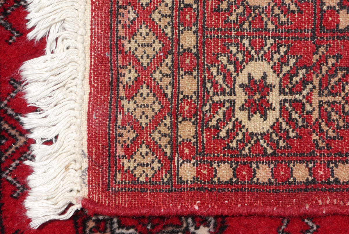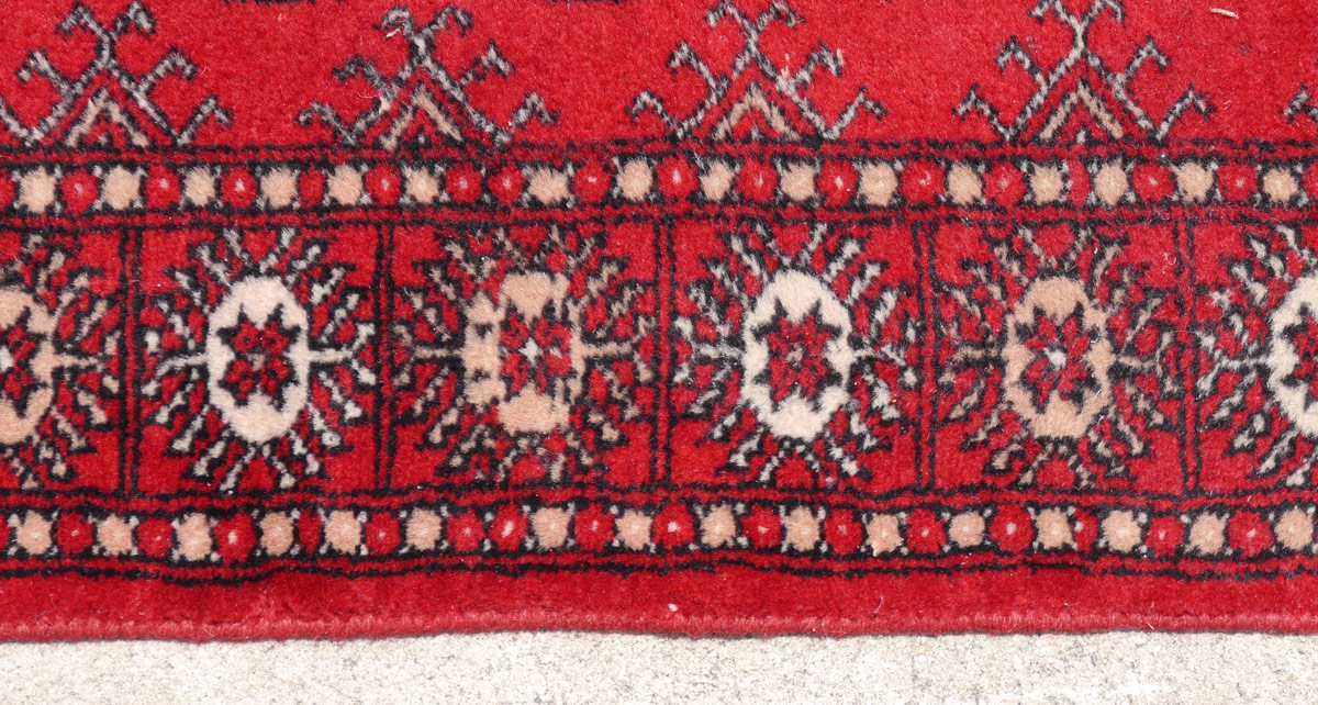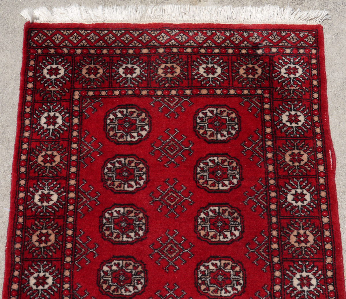 25-45 YRS OLD PAKISTANI BOKHARA PATTERN HAND KNOTTED WOOL RUNNER, 2'8'' x 10': This red ground field runner has a traditional Bokhara design with two different ''guls'', one oval white with red center and one stick star-like gul alternating in lines over the length of the rug. The red ground border has a gul that looks like a composite of the two designs found in the field.