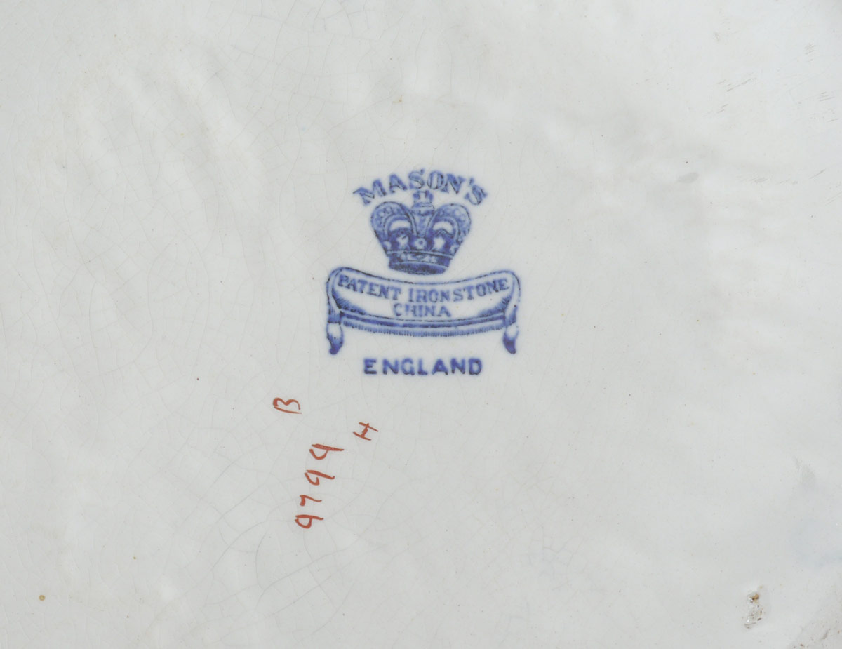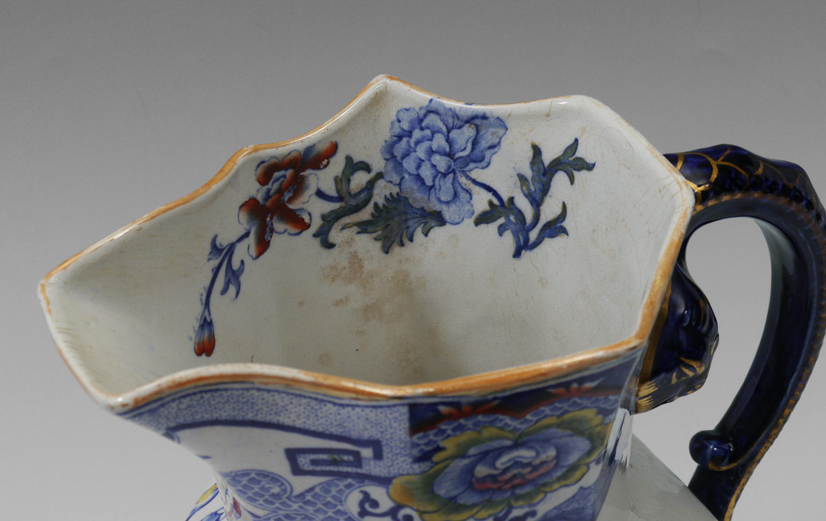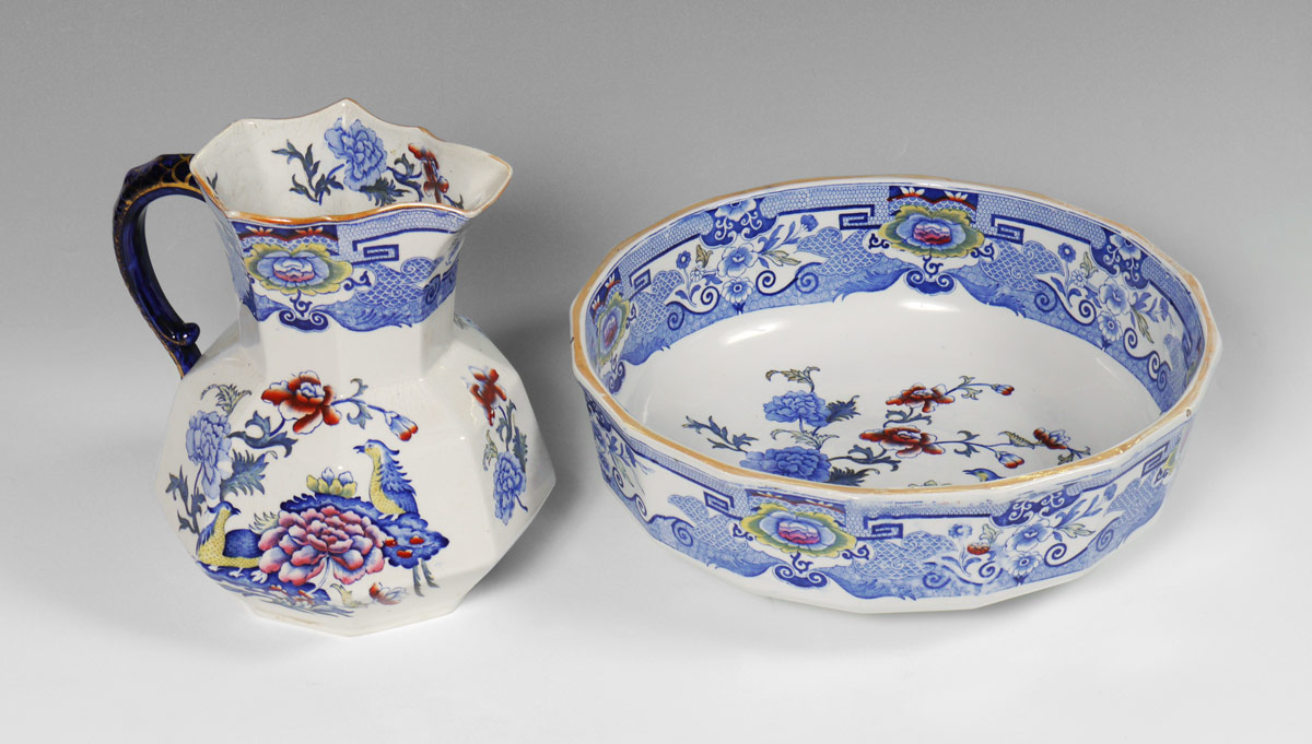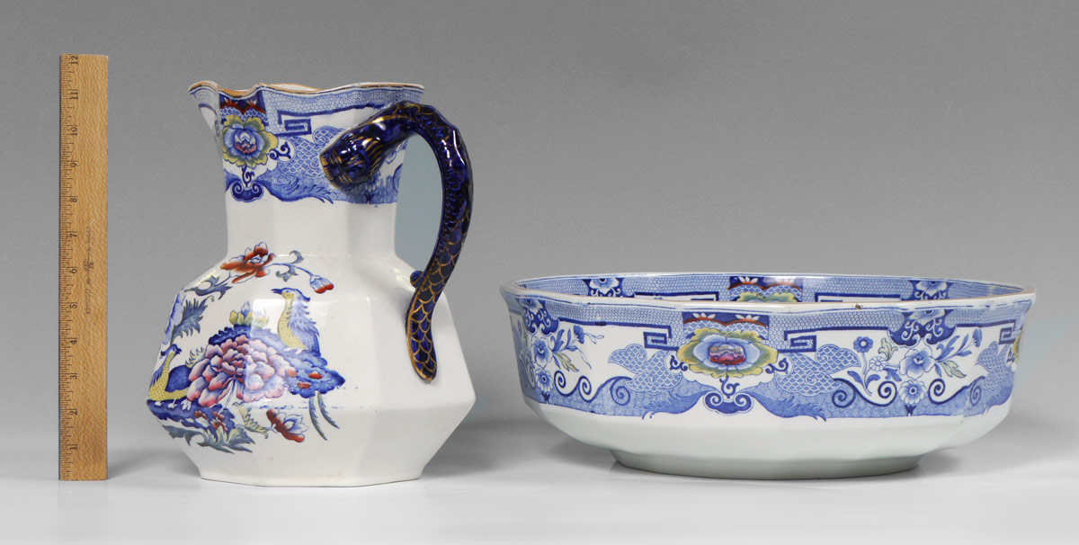 MASONS IRONSTONE PITCHER & BOWL SET: Well decorated in a polychrome chinoiserie pattern. The serpent handle pitcher measures approx. 11.5'' tall, the basin 16'' dia. x 5'' tall.