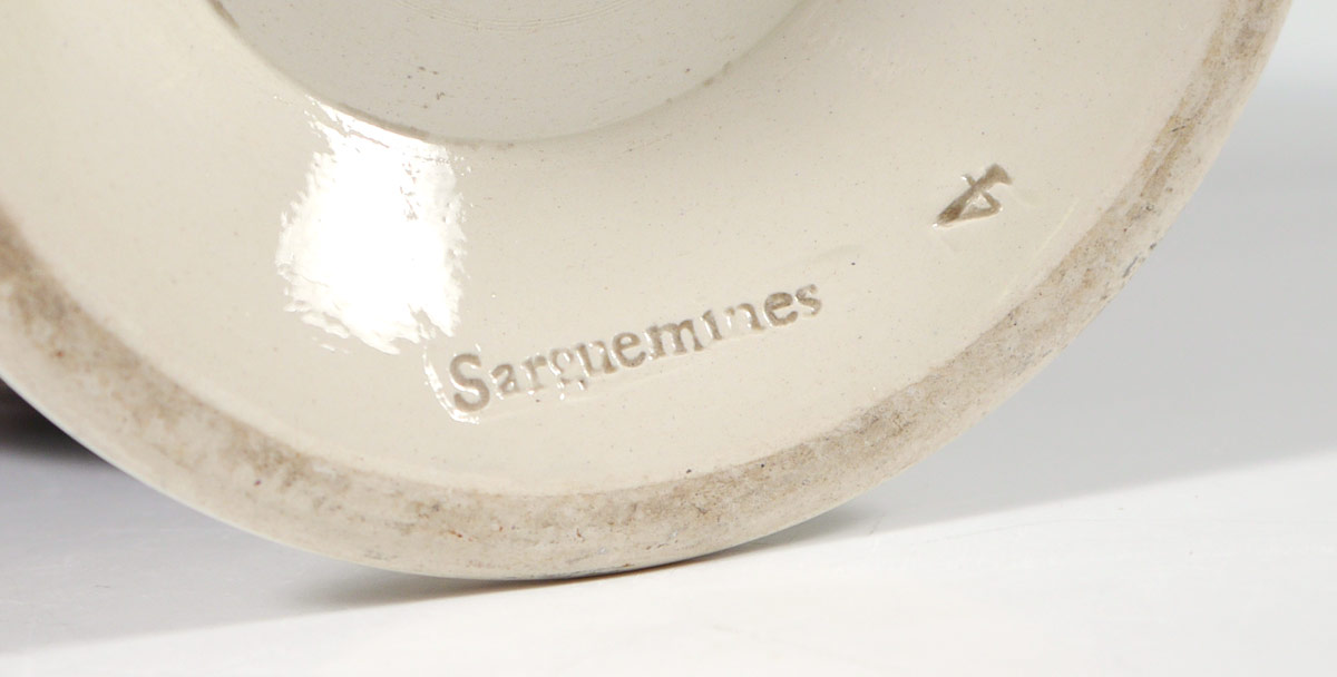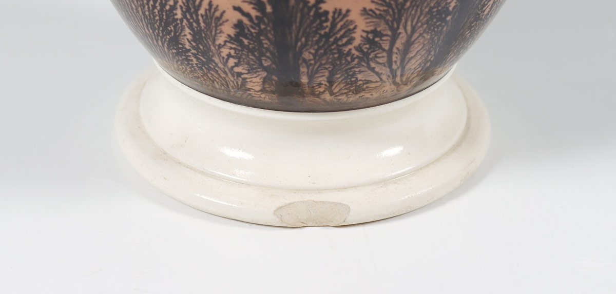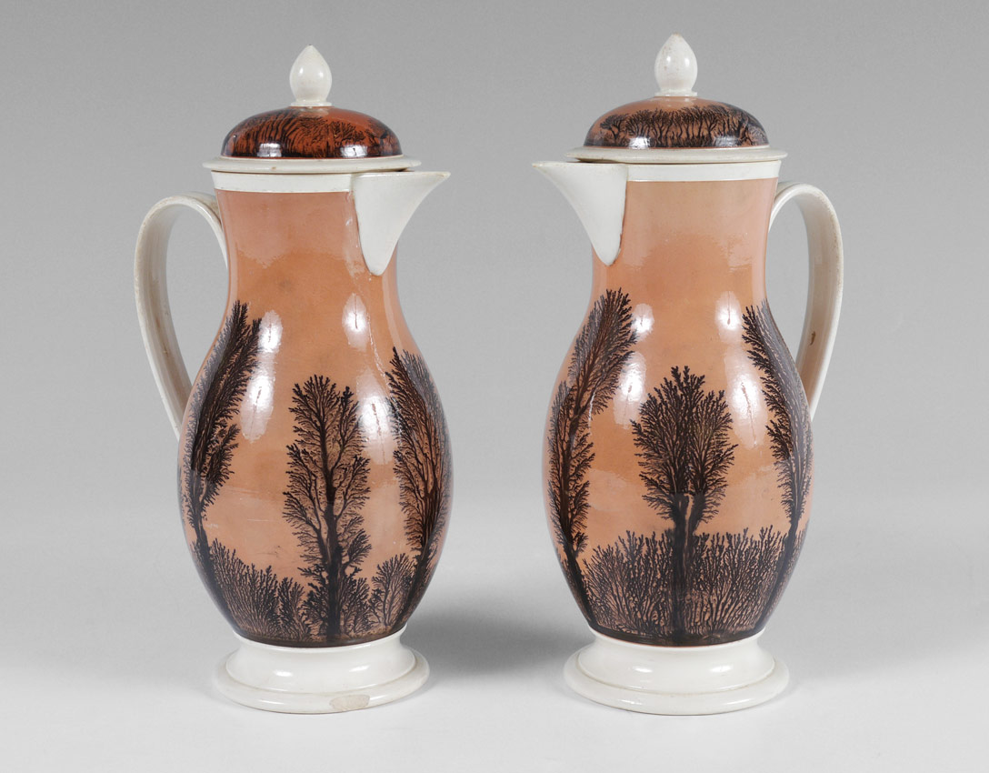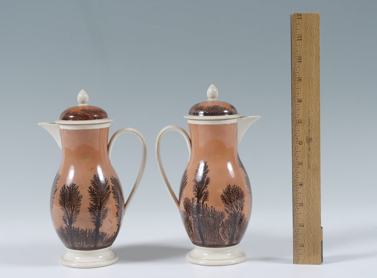 2 SARREGUEMINES MOCHA WARE PITCHERS DECORATED IN THE SEAWEED PATTERN: Each with a lid. Measures 8 3/4'' all inclusive. Impressed ''Sareguemines''.