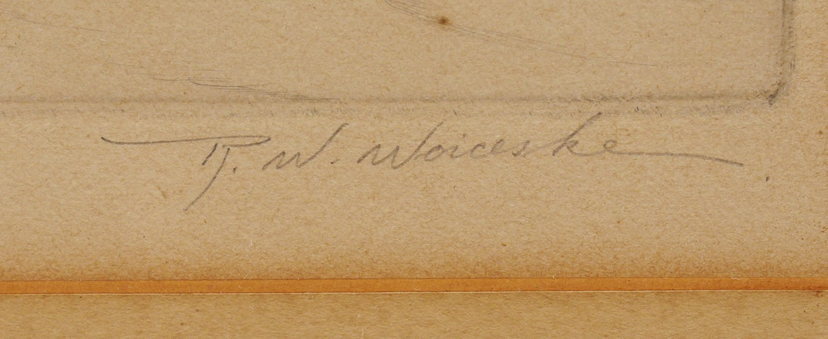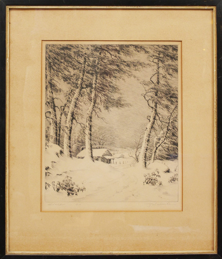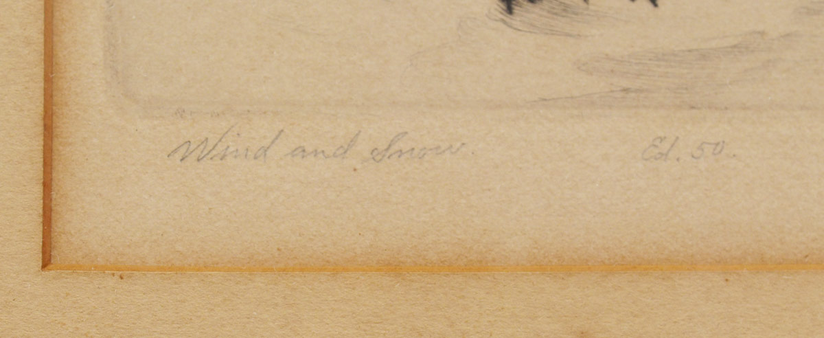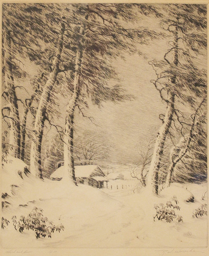 WOICESKE, R.W., (American, 1887-1953): ''Wind and Snow'', Etching, Edition of 50, Sight size 13 1/2'' x 11 1/4'', pencil signed lower right, titled lower left, encased in original ebonized frame with wear 21 1/4'' x 18 1/4''.