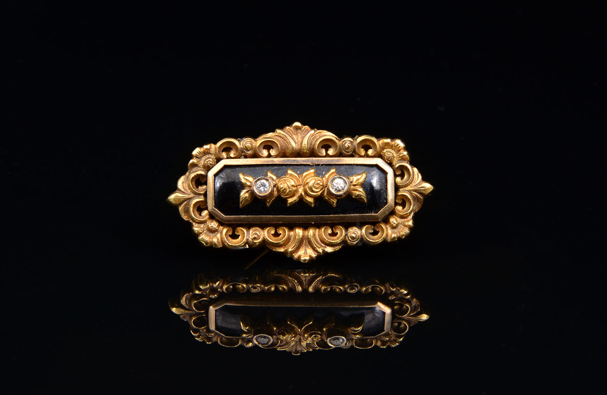 ANTIQUE 18K ONYX AND DIAMOND BROOCH: 18K yellow gold brooch with onyx and 2 full cut diamonds totaling approx. .10 Ct. Approx. VS-SI in clarity and H-I in color. Bar pin closure. Length: 1 3/4''. Weight: 13.3 grams.
