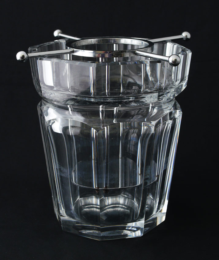 BACCARAT FRENCH CRYSTAL WINE COOLER: Marked on base, sold with silverplate insert. Cooler 9 1/8'' x 8 1/4'', insert 7'' x 10 3/8''.