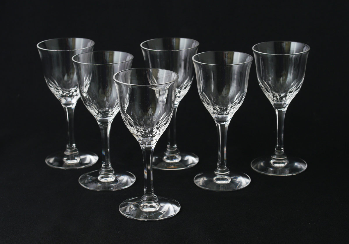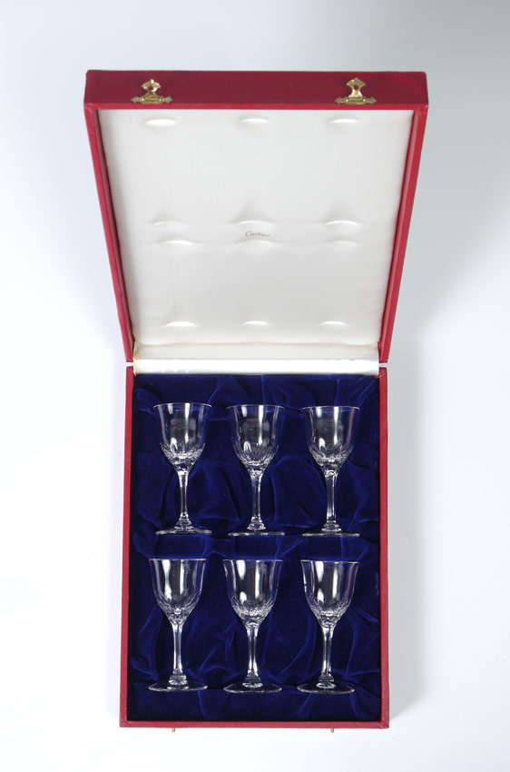 6 CARTIER CRYSTAL CORDIAL STEMS IN PRESENTATION BOX: Each etched with Cartier, 4'' h., in original presentation case. 2 3/8'' x 11 1/2'' x 8 1/2''.
