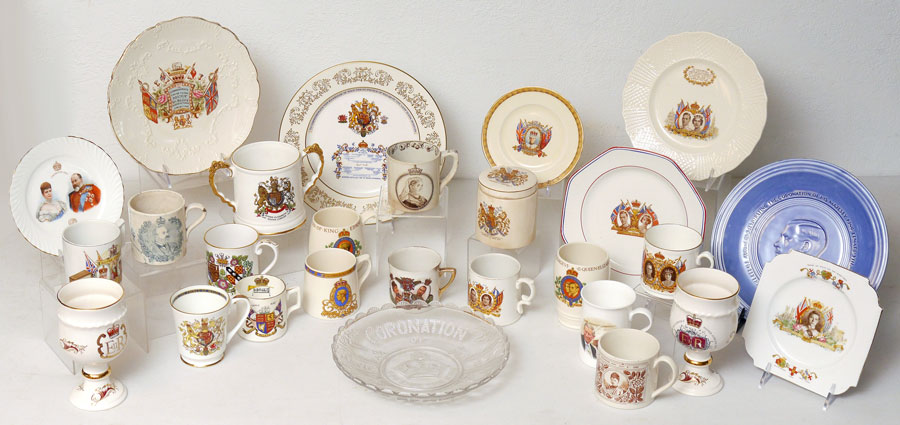 COLLECTION BRITISH ROYALTY COMMEMORATIVES: Approx 26 pieces to include 12 cups, 7 plates (6-10''), 2 goblets, 1 covered jar, loving cup and a 1937 King George VI glass plate. Represented are Coronations, Jubilees, and Weddings of King Edward VII, King George IV, 1887 Queen Victoria, Duke of York with Princess May, Princess Diana, and Queen Elizabeth.