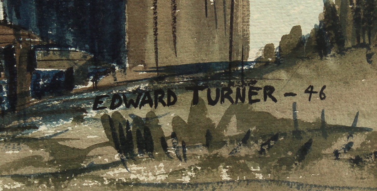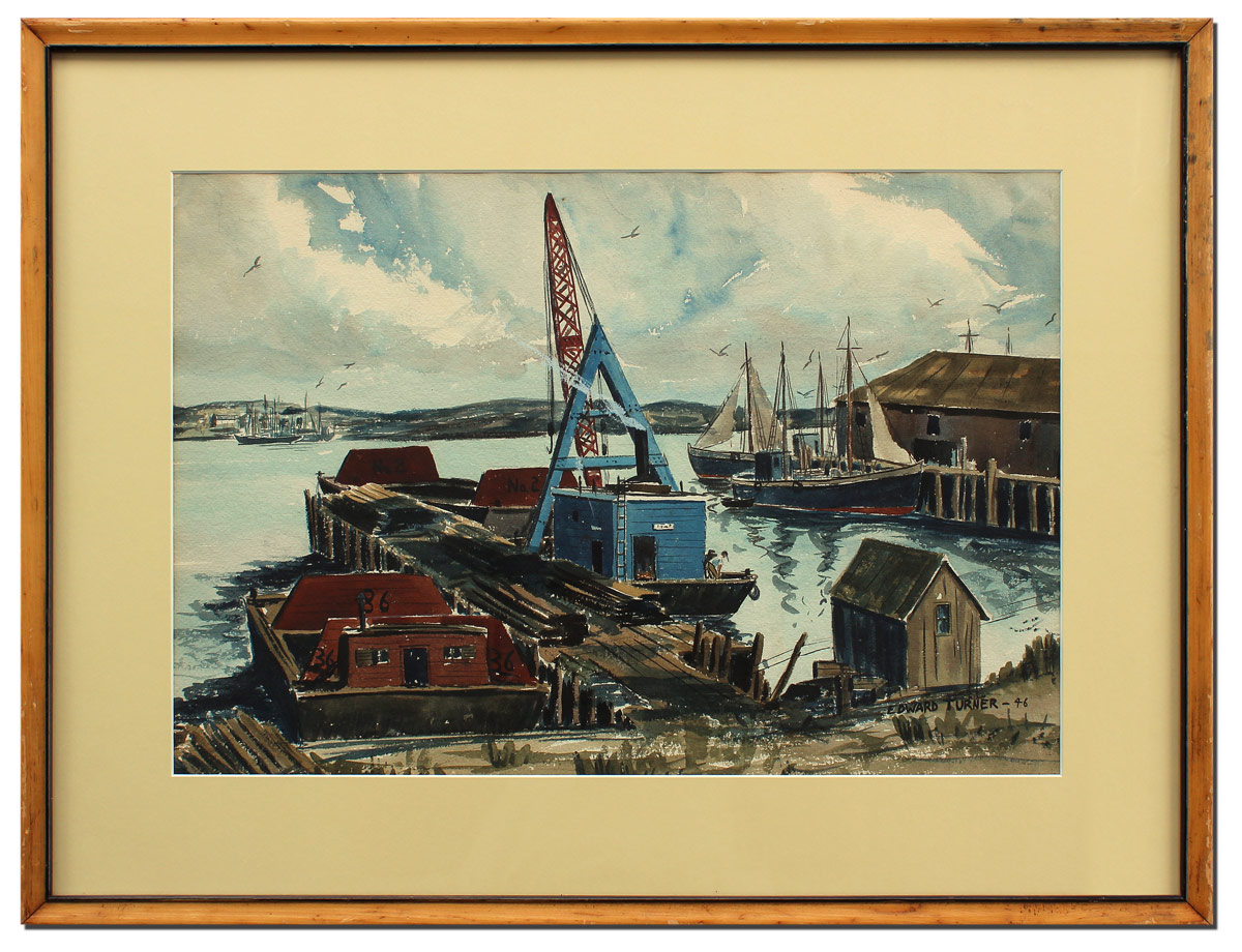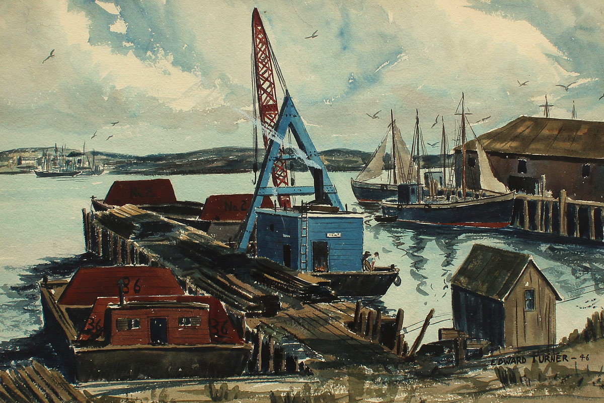 TURNER, Edward, (American, 19th Century): WPA Style Dockside Scene, Watercolor, Sight size 14'' x 20 3/4'', signed lower right, dated '46, encased in wooden frame with wear 21 1/8'' x 28 1/4''.