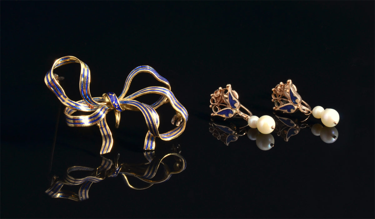 ENAMELED GOLD RIBBON BROOCH AND EARRINGS: 18K yellow gold ribbon form brooch, Italian made, Weight: 8.7 grams. Sold with 14K gold with enameling and pearl drops, screw back closures. Earring Weight: 3.2 grams