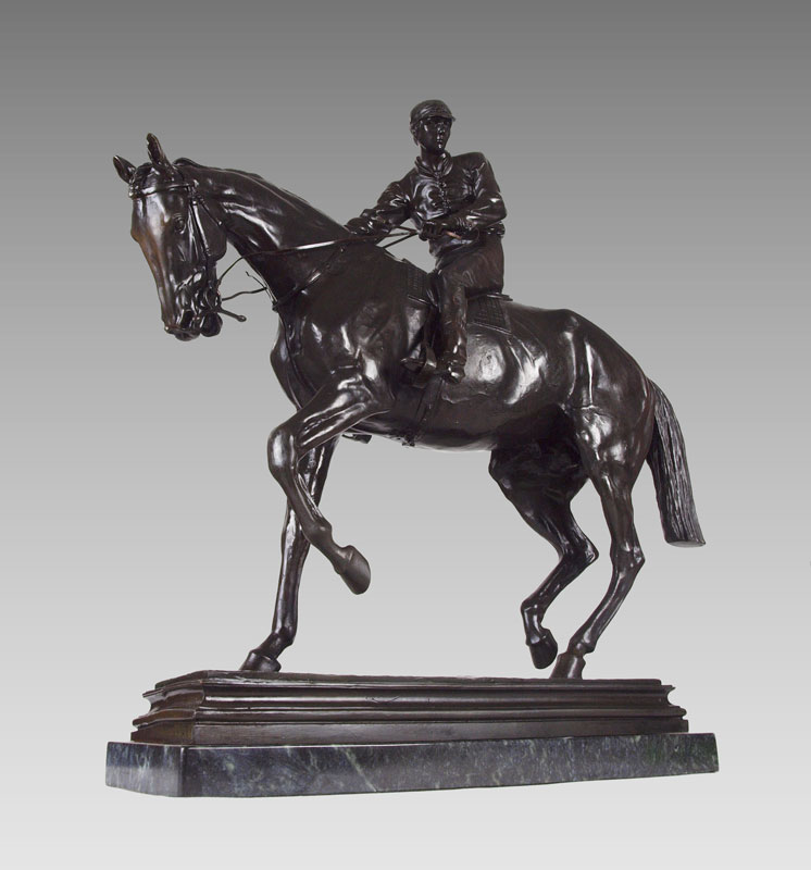 LARGE HORSE AND JOCKEY BRONZE AFTER ISIDORE BONHEUR: 23'' h x 24'' w, with green pedestal, 24''h overall, incised signature.