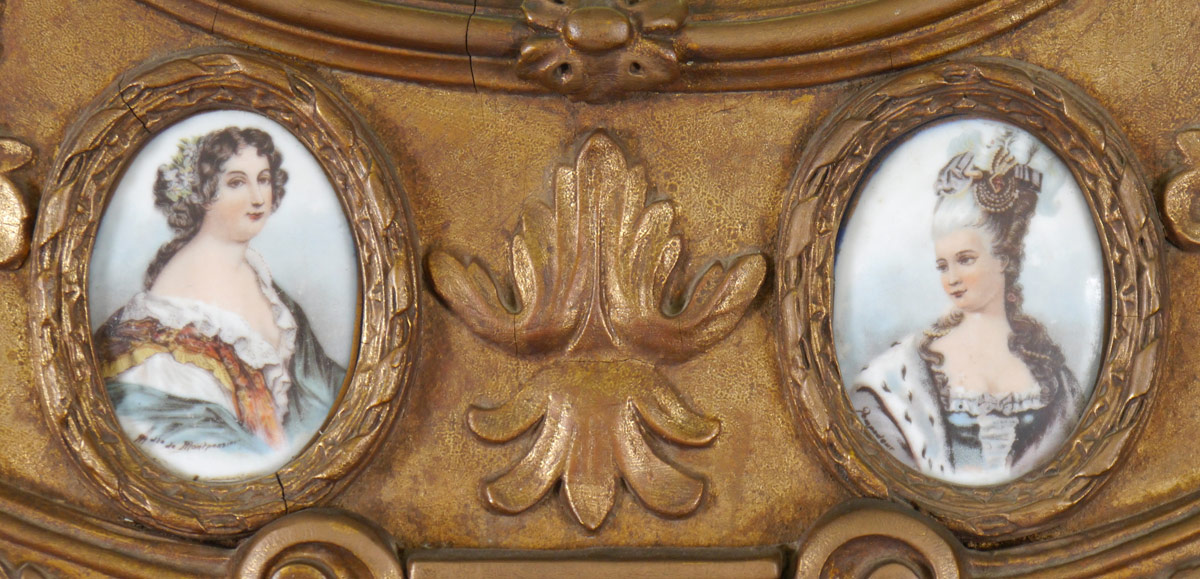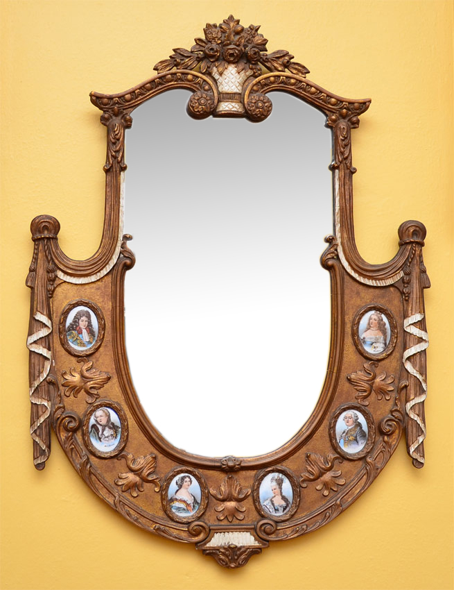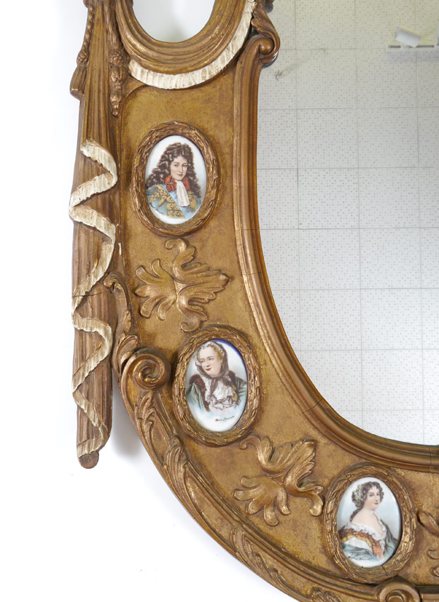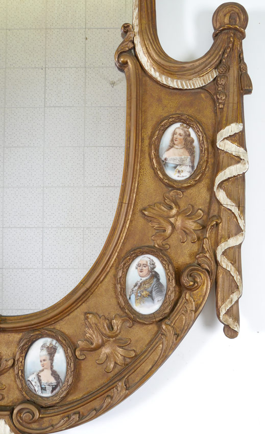 FRENCH CARVED GILT WOOD WALL MIRROR WITH PORCELAIN PLAQUES: Gilt wood carved and shaped frame with floral basket crest and swags on either side. Inset transfer porcelain plaques of French royalty to include the Grand Dauphin, Marie Leczinska, Madame de Montpensier, Madame de Pompadour, Louis XVI, Marie Therese. 42 1/2'' h. x 29'' x 2''.