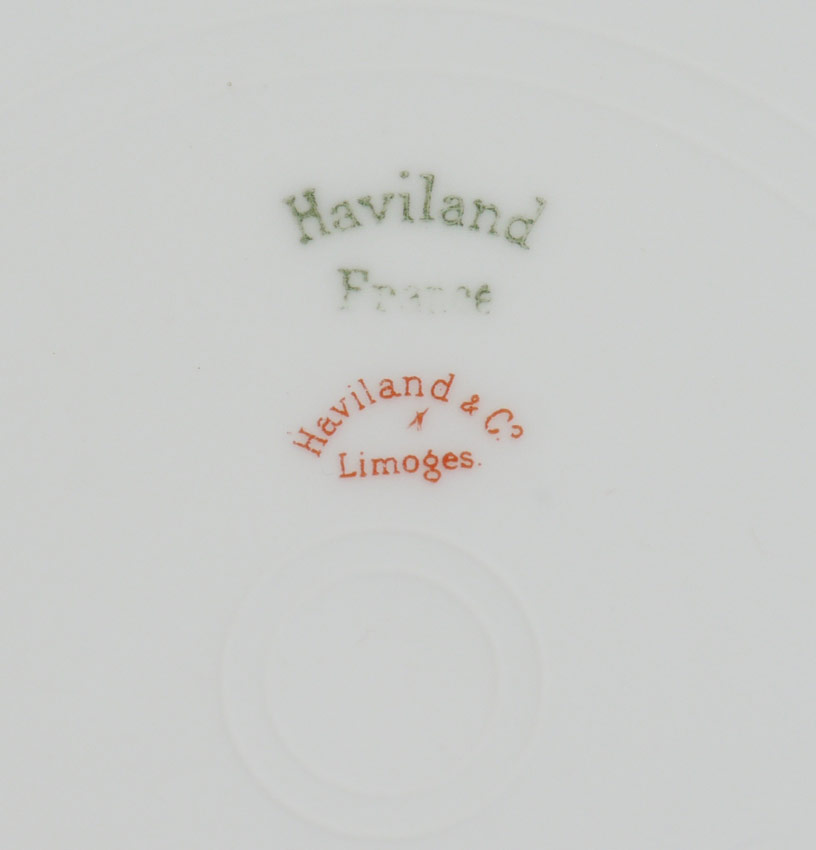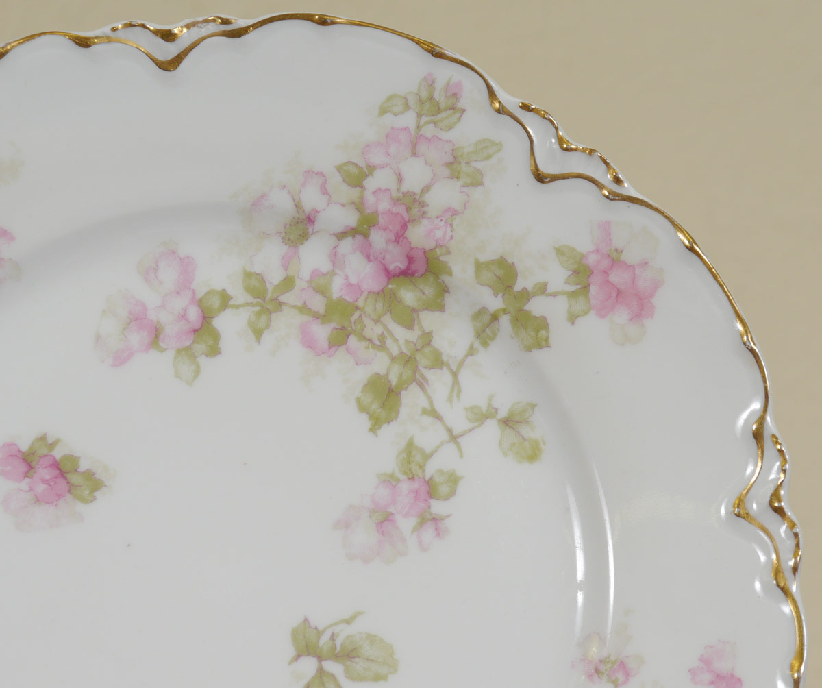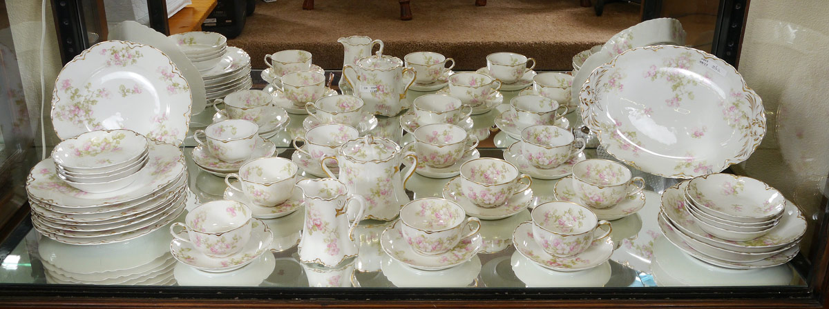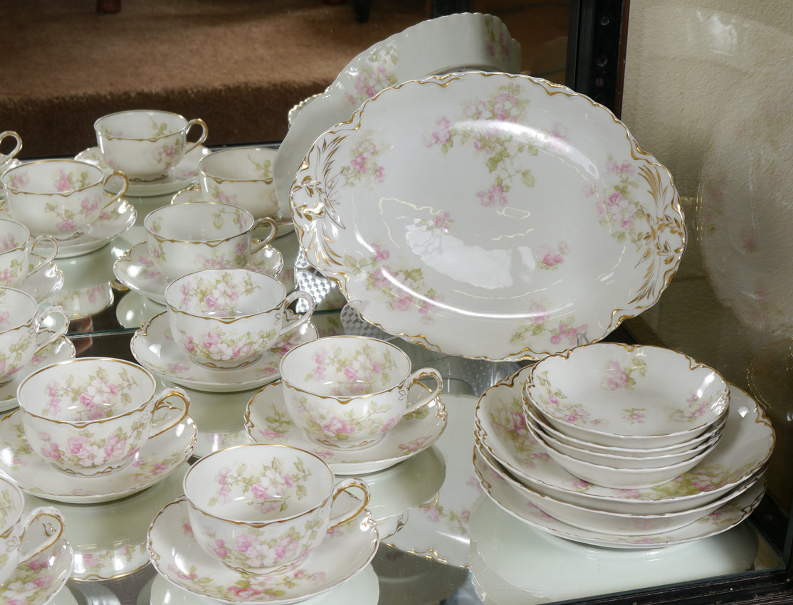 EARLY 1900's HAVILAND FRENCH LIMOGES BREAKFAST OR LUNCHEON SERVICE: Approx. 39 pieces to include 8 plates (8.25''), 8 fruit or dessert bowls, 10 cups, 8 saucers, 2 small serving bowls (7.5''), the 11.5'' platter, and the cream pitcher with covered sugar.