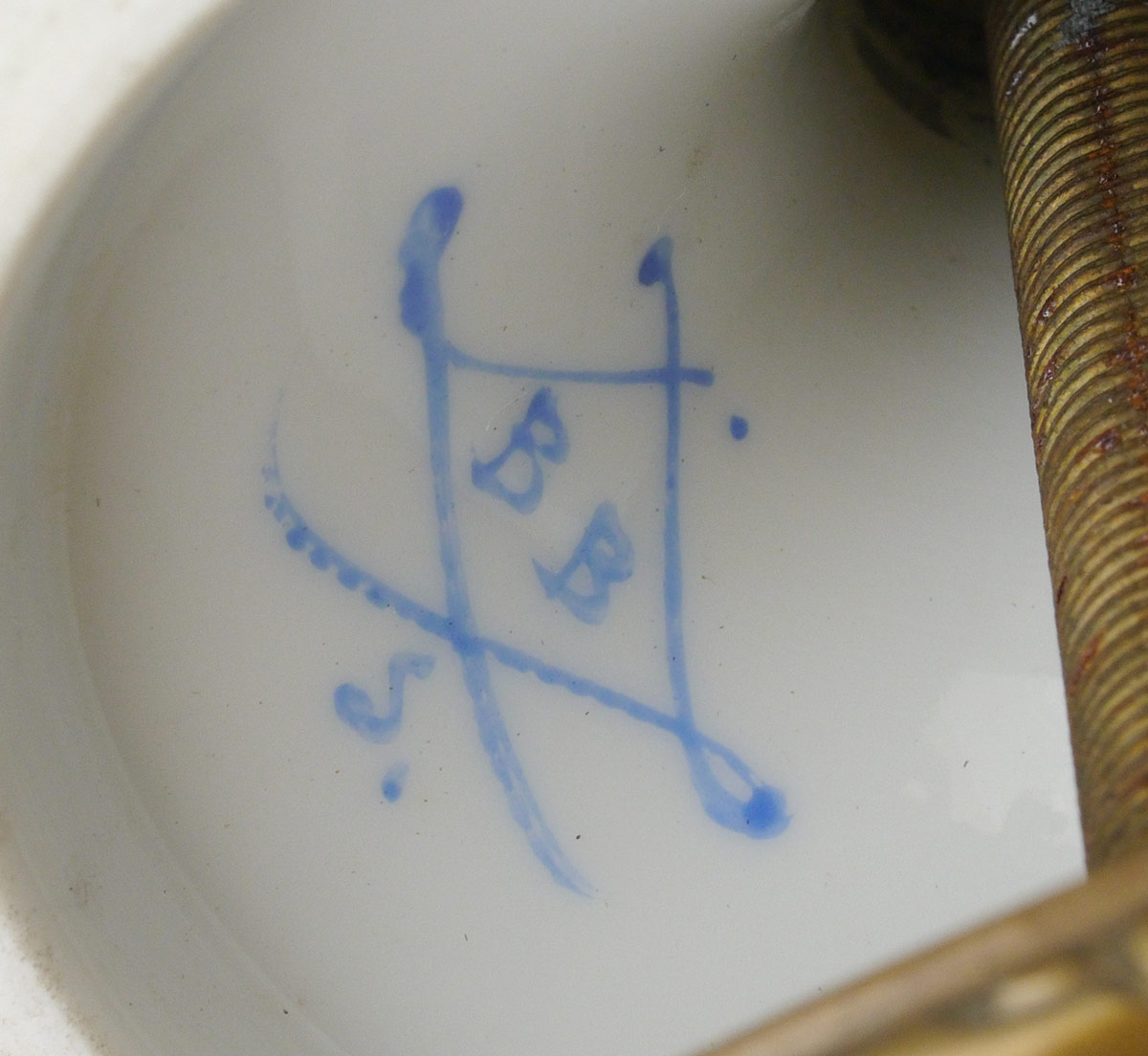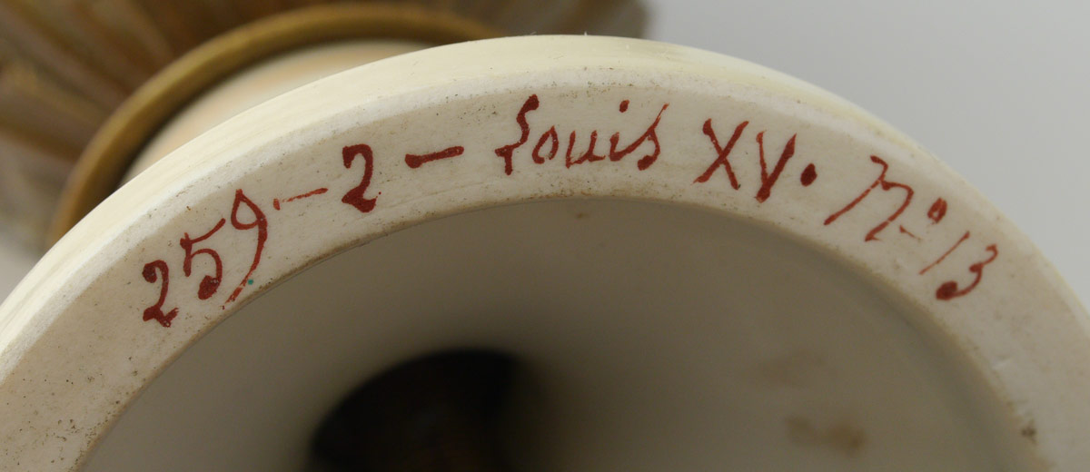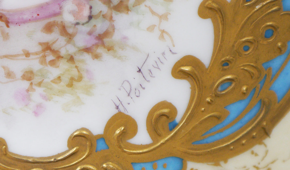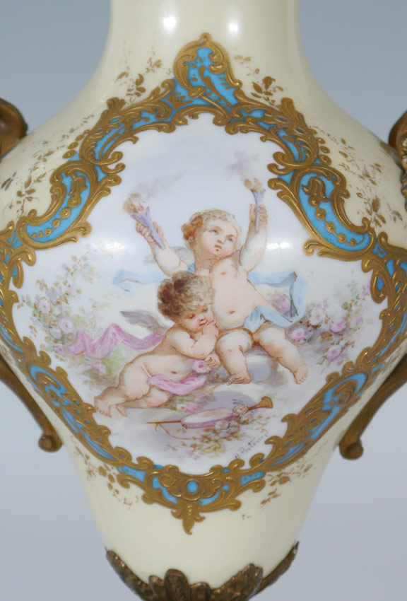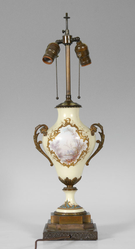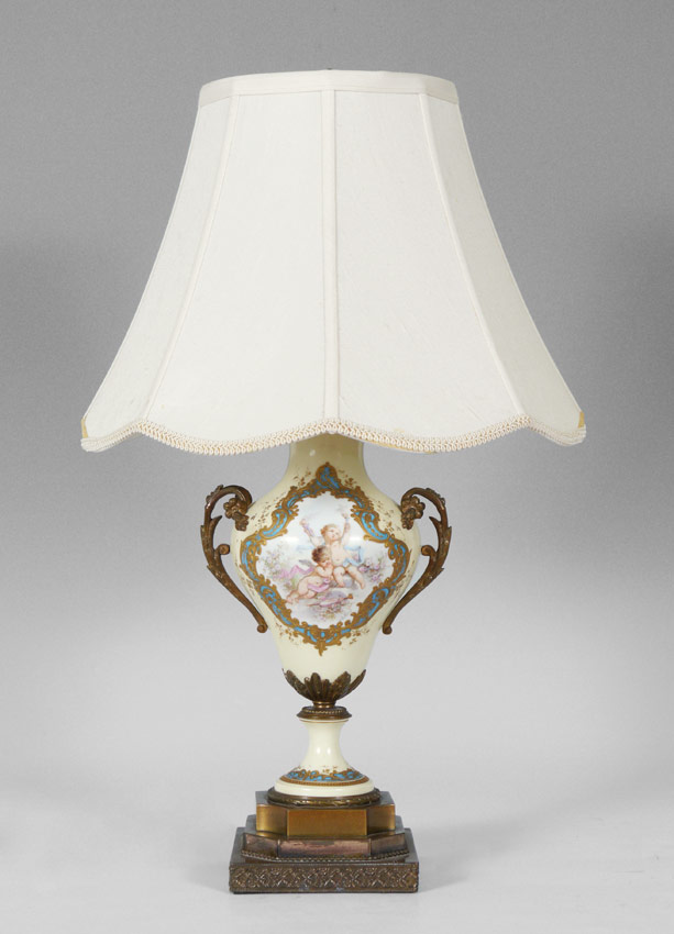 H. POITEVIN SEVRES STYLE MOUNTED PORCELAIN LAMP: Ormolu mounted Sevres style urn converted to lamp. Hand painted cherub motif signed H. Poitevin, outdoor genre scene verso. Spurious Sevres date marks, also marked along base rim ''259-2-Louis XV-77-13''. On stepped embossed metal base. Double socket fixture. Overall measures 25 1/2'' h. x 8''.