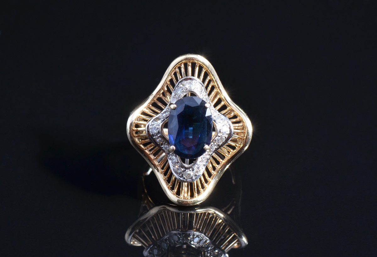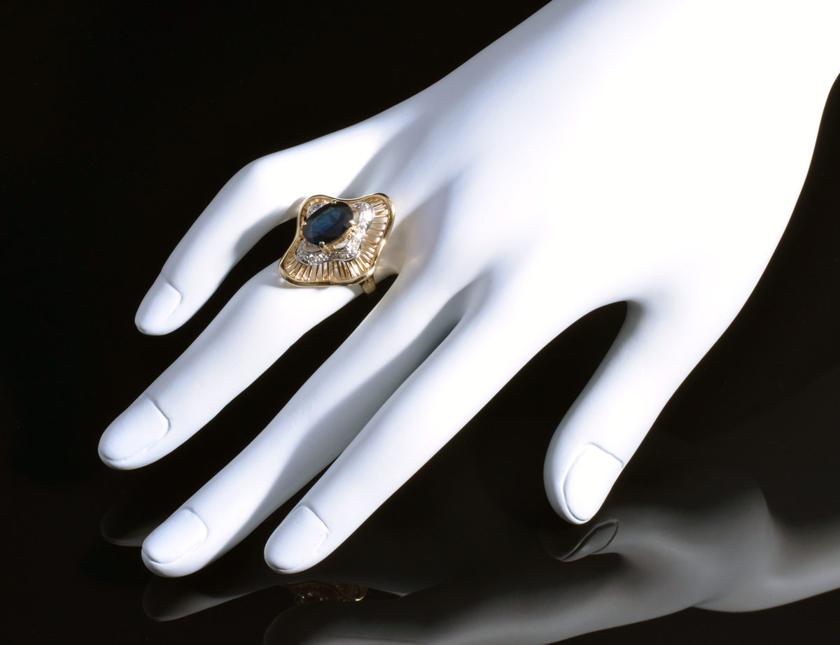 14K SAPPHIRE & DIAMOND RING: 14K yellow gold ring. Oval mixed cut sapphire in a wave of yellow gold. The sapphire is approx. 3.00 Ct. The round full cut diamonds total approx. .25 Ct., SI in clarity and H-I in color. Weight: 6.8 grams. Size: 5