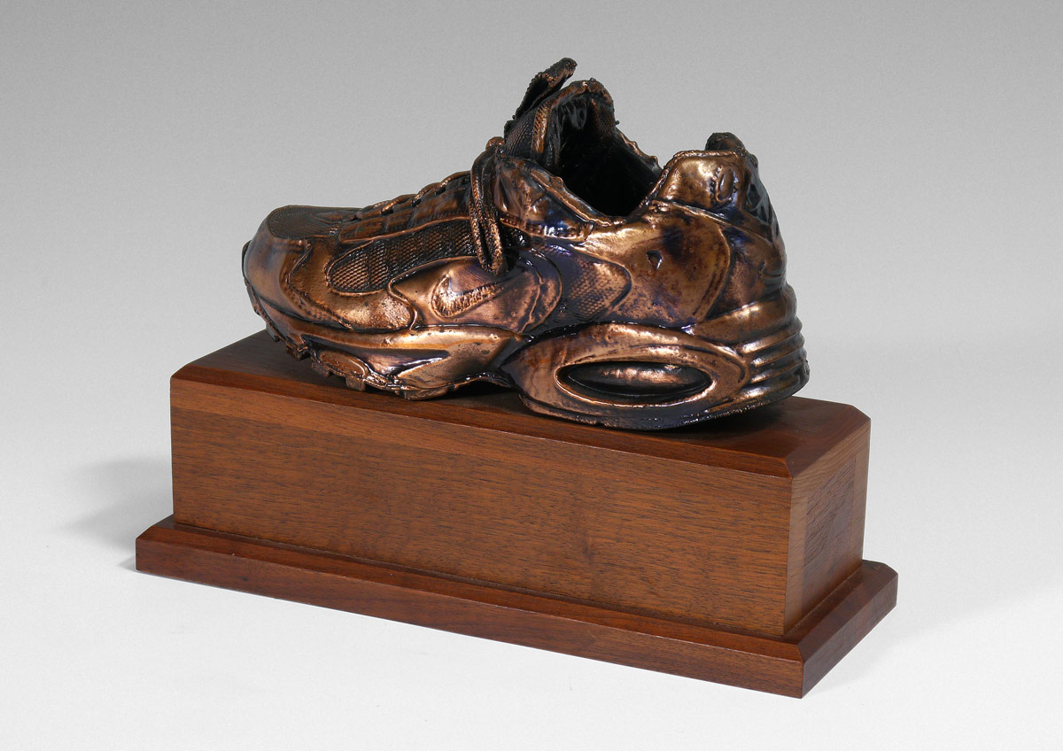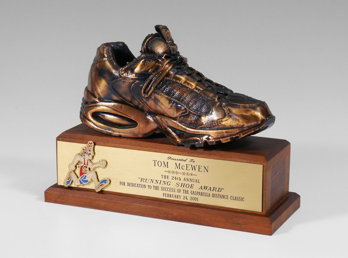 TOM McEWEN GASPARILLA RUNNING SHOE AWARD: Bronzed Nike running shoe affixed to wood base. Plaque reads ''Presented To Tom McEwen, The 24th Annual ''Running Shoe Award'' For Dedication to the Success of the Gaspirilla Distance Classic, February 24, 2001''. Overall 10'' h. x 13'' x 5''.
