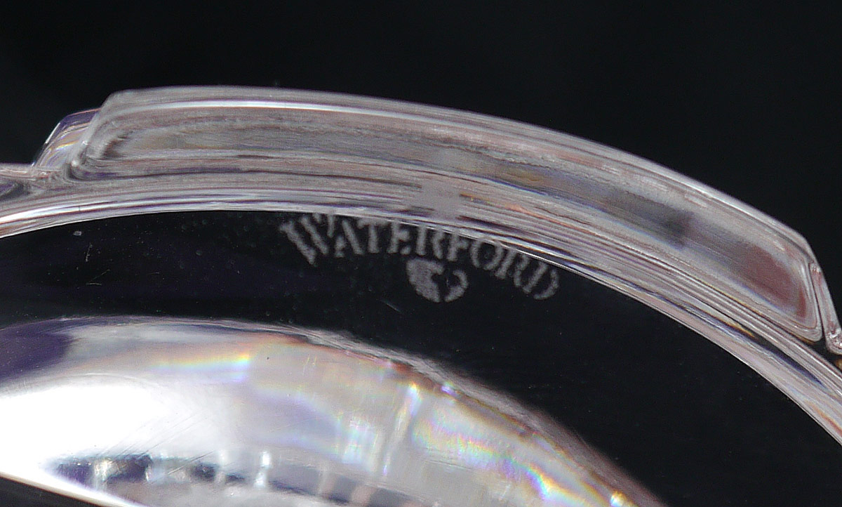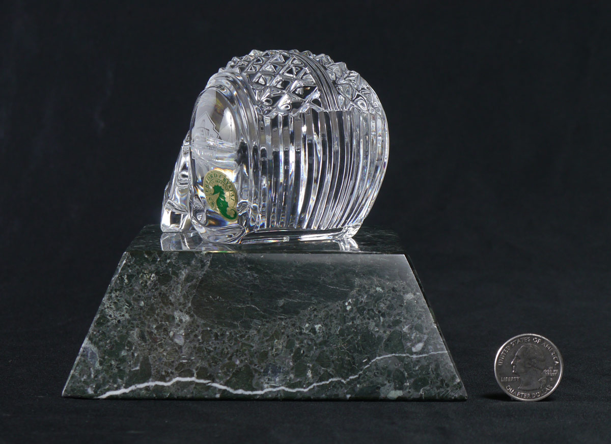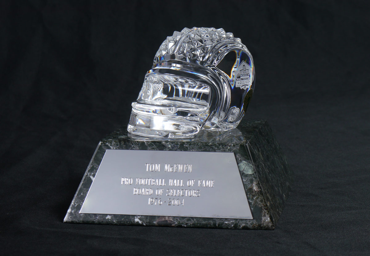 TOM McEWEN FOOTBALL HALL OF FAME WATERFORD TROPHY: Waterford trophy in the shape of a football helmet, etched with the Hall of Fame logo. Green marble base with plaque ''Tom McEwen, Pro Football Hall of Fame Board of Selectors, 1976-2004''. Helmet 2 3/4'' h. x 4'' x 3'', base 2 1/4'' x 5 3/4'' x 5 3/4''.
