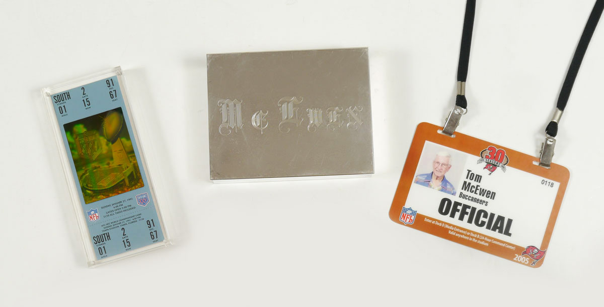 TOM McEWEN SUPERBOWL TICKET, PRESS PASS AND BOX: 3 piece from noted Tampa Bay sports columnist to include 1) 1991 Superbowl ticket encased in Lucite. 3/4'' x 7'' x 3 1/4''. 2) 2005 NFL, Tampa Bay Buccaneers official press pass on lanyard. 3) Towle silverplate humidor with 2 compartments. Engraved McEwen on top of hinged lid. 1 1/4'' h. x 6'' x 4 3/4''.