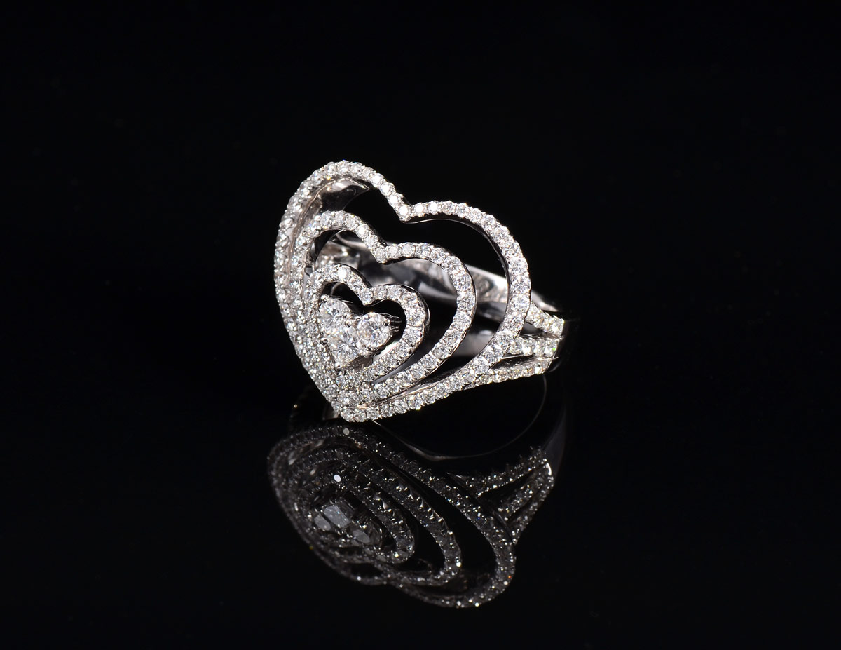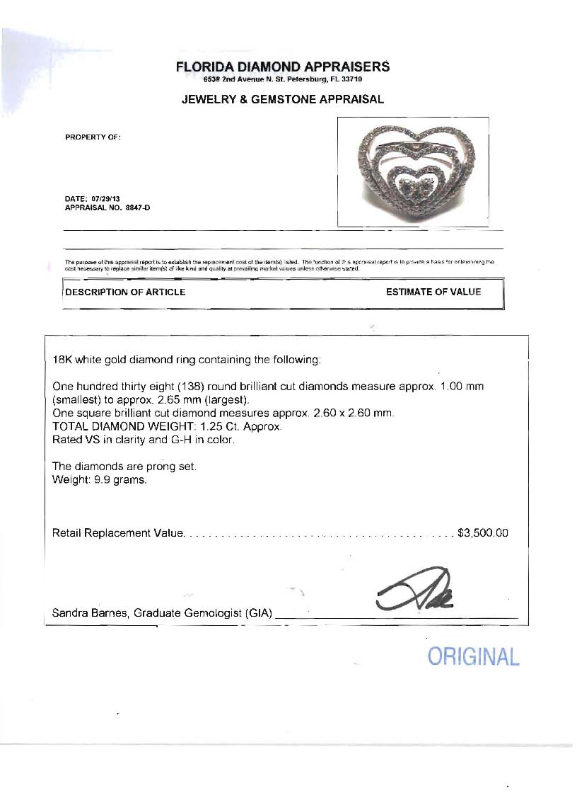 18K DIAMOND HEART RING: 18K white gold ring in a silhouette of hearts design. Diamonds total approx. 1.25 Ct., rated VS in clarity and G-H in color. Prong set. Size 6.5. Weight 9.9 grams. Sold with current Florida Diamond Appraisers GIA graduates appraisal for $3500.