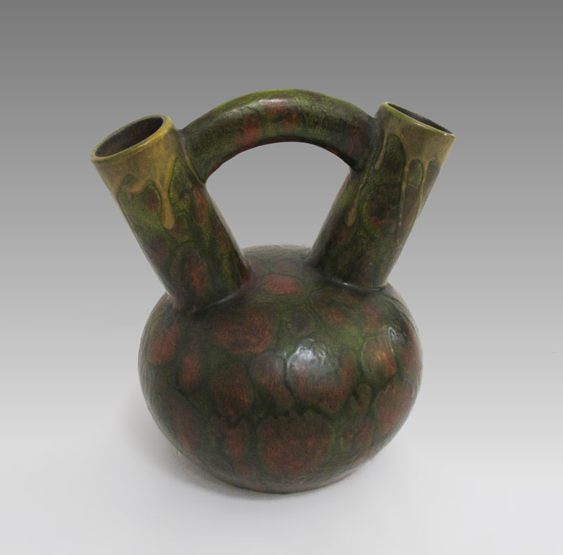 LES YVELINES POTTERY WEDDING VASE: In the style of Santa Clara pottery wedding vase, mottled green, red and yellow glaze. Signed on base 19 Les Yvelines, 8 1/4'' h. x 7 1/4''.