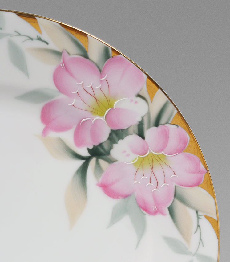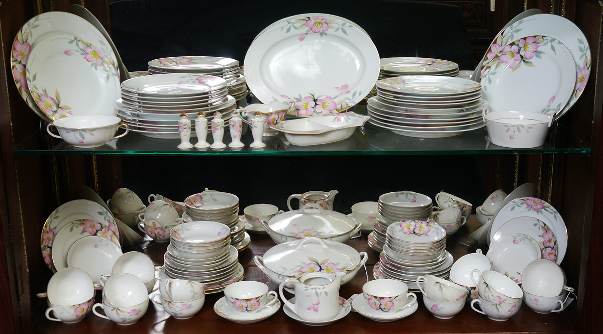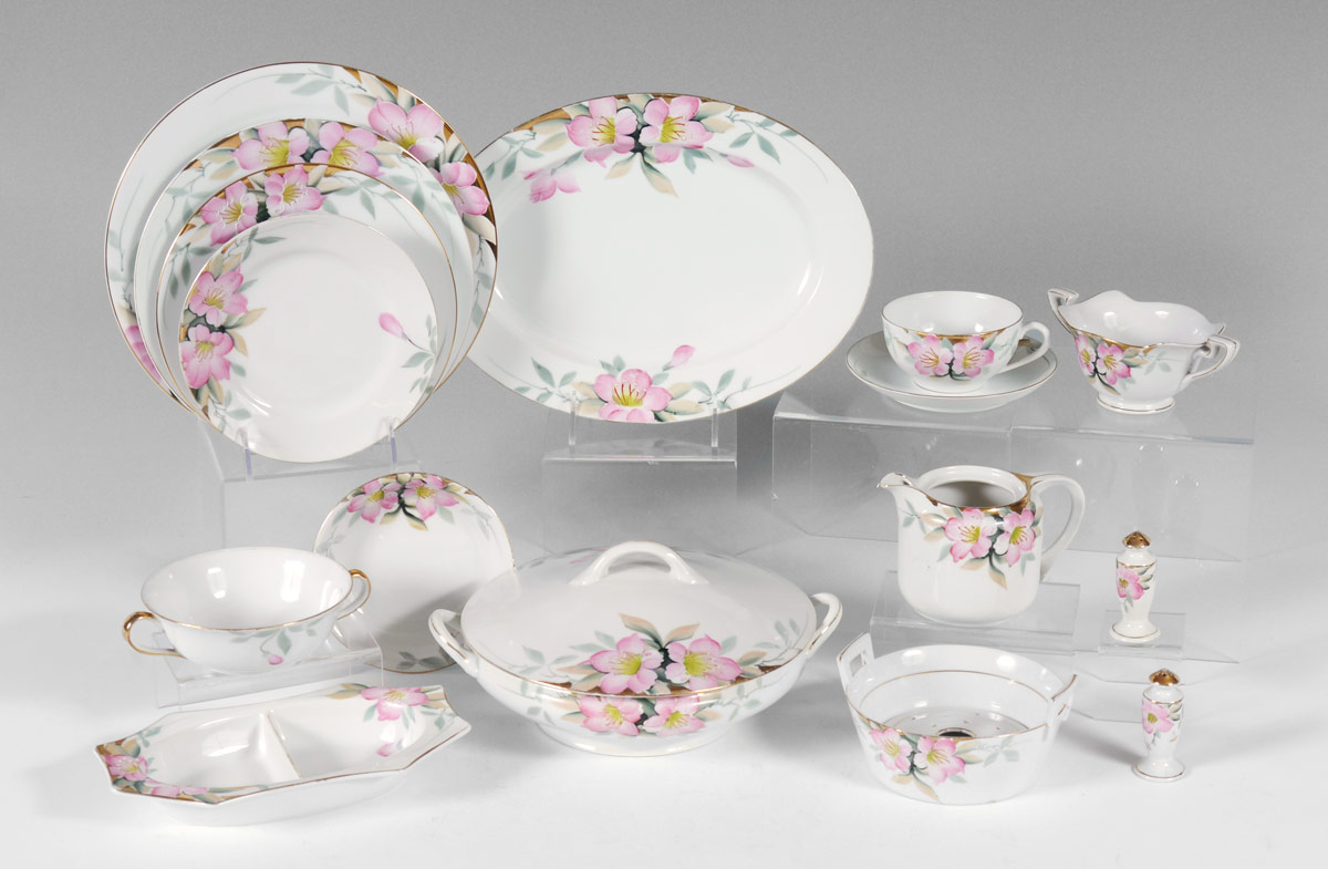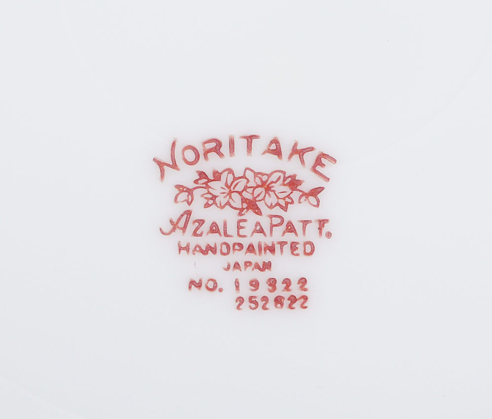 NORITAKE AZALEA CHINA SERVICE: Approx. 90 pieces in the Azalea (252622 and 19322) pattern by Noritake to include 12 dinner plates (10''), 12 luncheon plates (8 1/2''), 6 salad plates, 11 bread plates, 11 dessert bowls, 6 bouillon cups, 1 cream soup, 12 teacups, 8 saucers, covered vegetable (10 1/4'' dia.), two part relish, open sugar, butter tub with insert, and 5 individual shakers.
