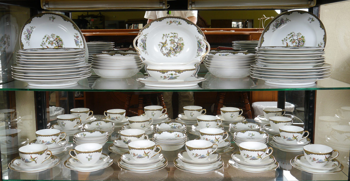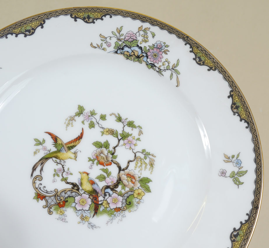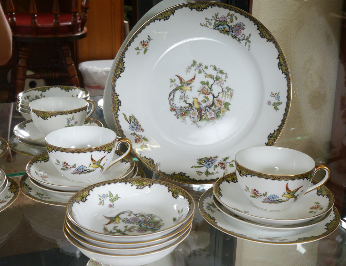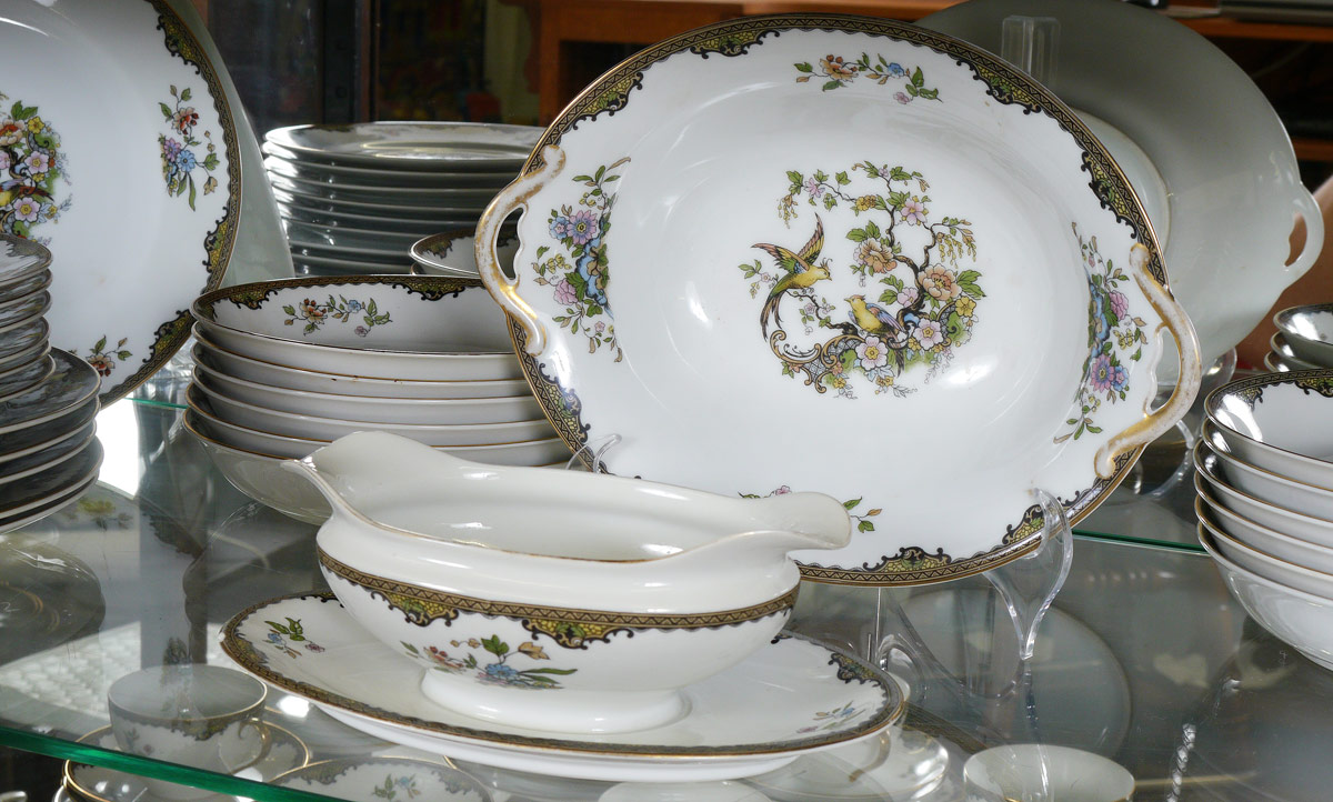 NORITAKE ''NAVARRE'' FINE CHINA SERVICE: An earlier Noritake bird pattern. Approx. 89 piece service to include 12 each of dinner plates (9 3/4''), luncheon plates (8 1/2''), bread plates, low soup bowls, dessert bowls, Also included are 10 cups, 17 saucers, the oval vegetable bowl, and gravy.