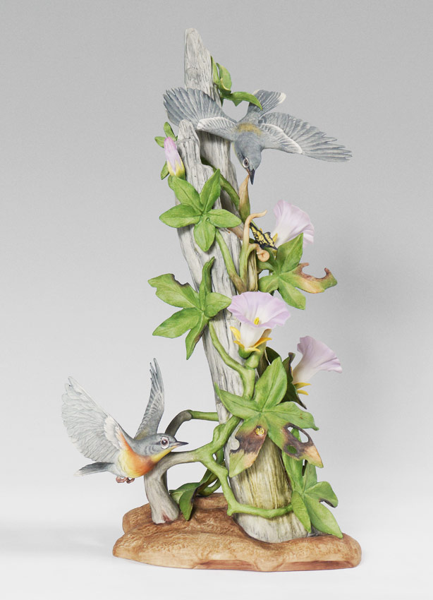 BOEHM PORCELAIN PARULA WARBLER FIGURAL GROUP: #484, 2 Parula warblers and flowers on branch. 15 3/4'' h. x 10'' x 8 1/2''.
