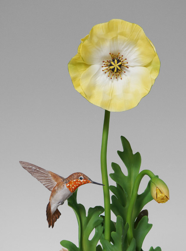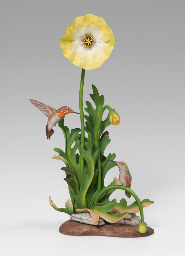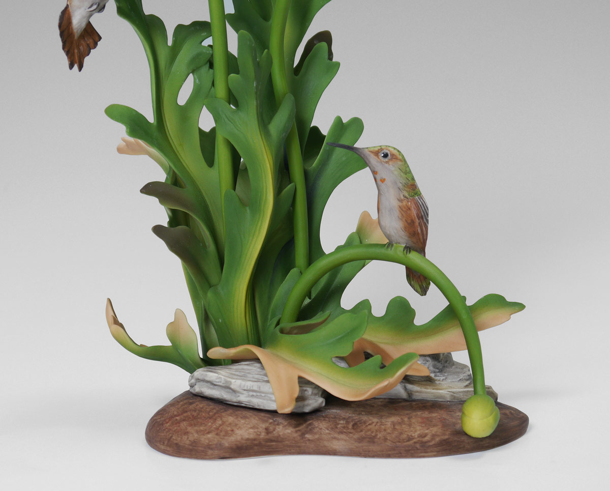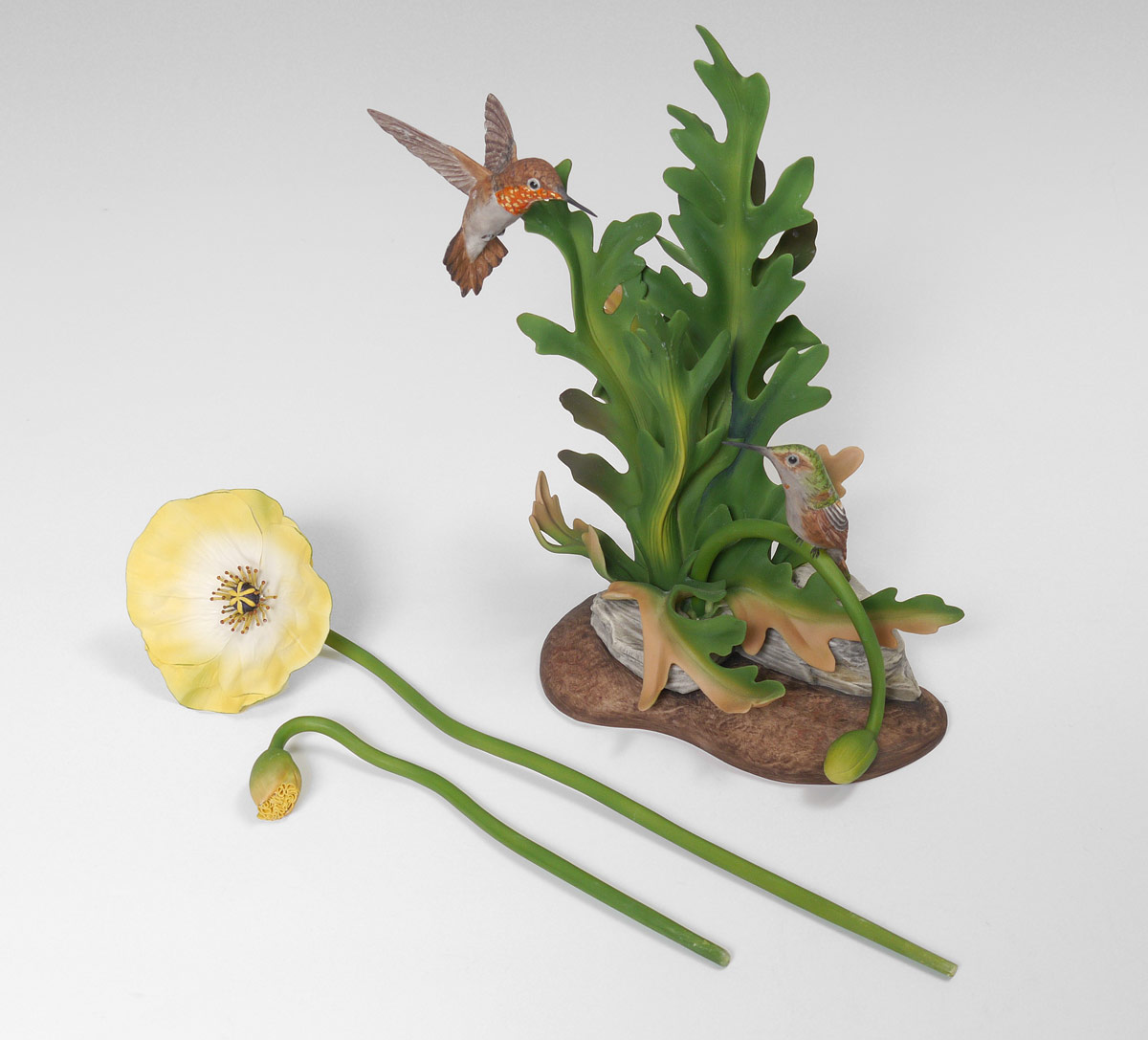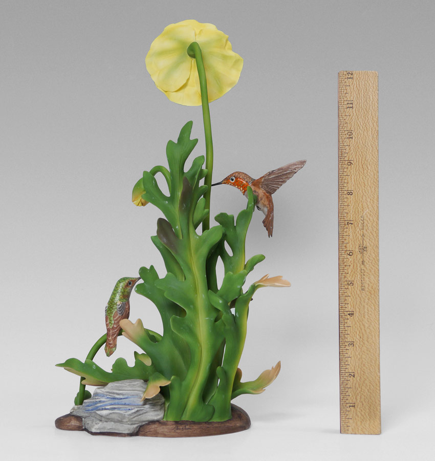 BOEHM PORCELAIN RUFOUS HUMMINGBIRDS: #487, figural group with 2 Rufous hummingbirds and 2 removable flowers. 14 1/2'' h. x 9'' x 6''.