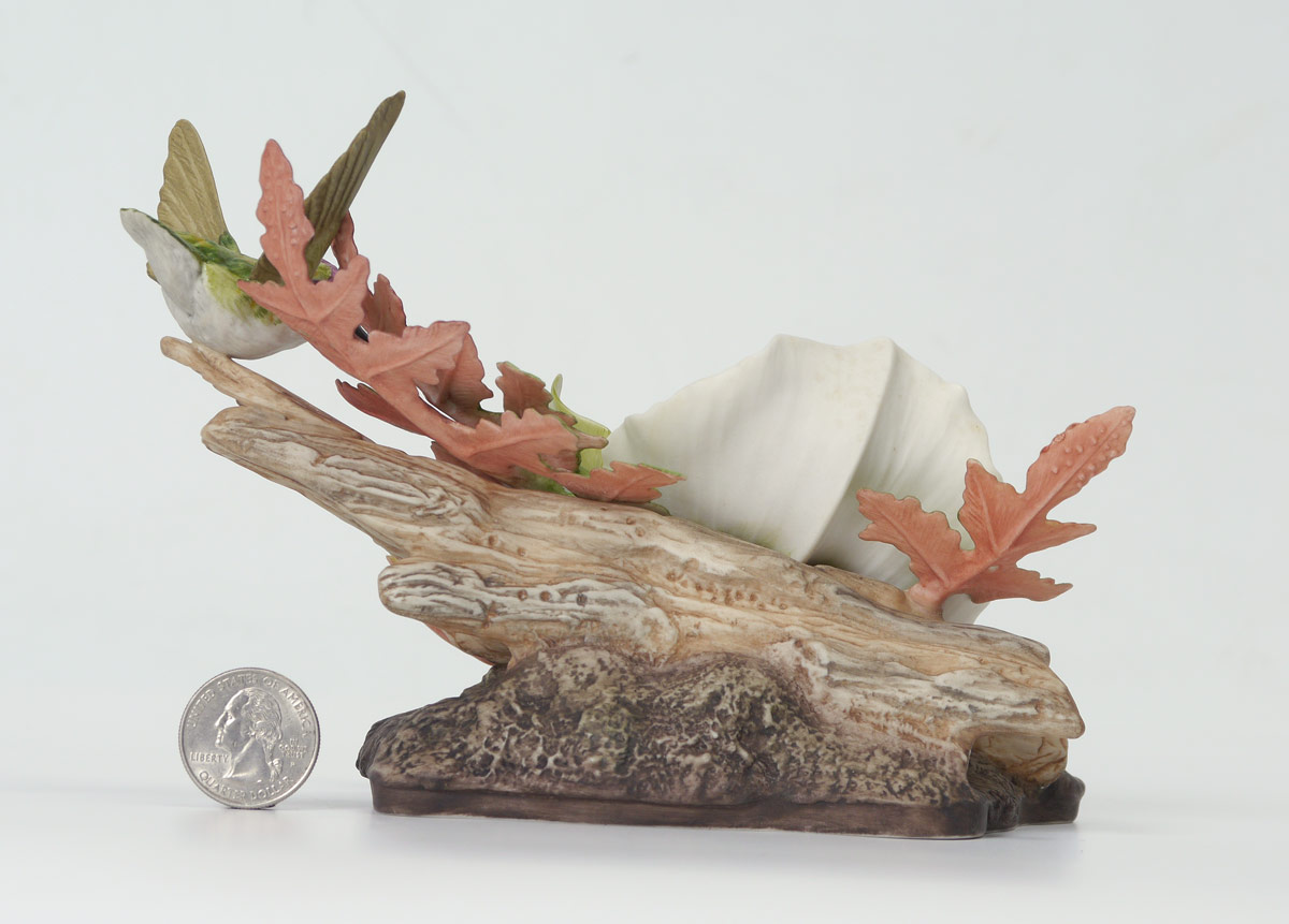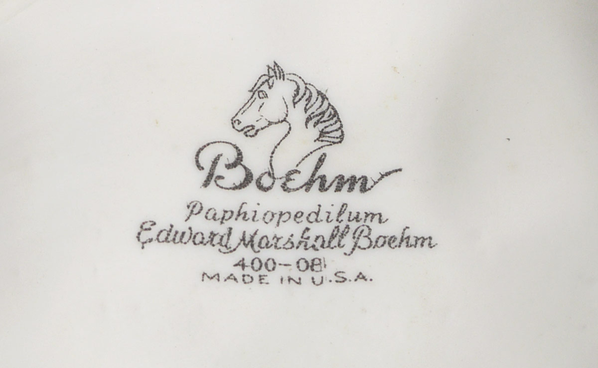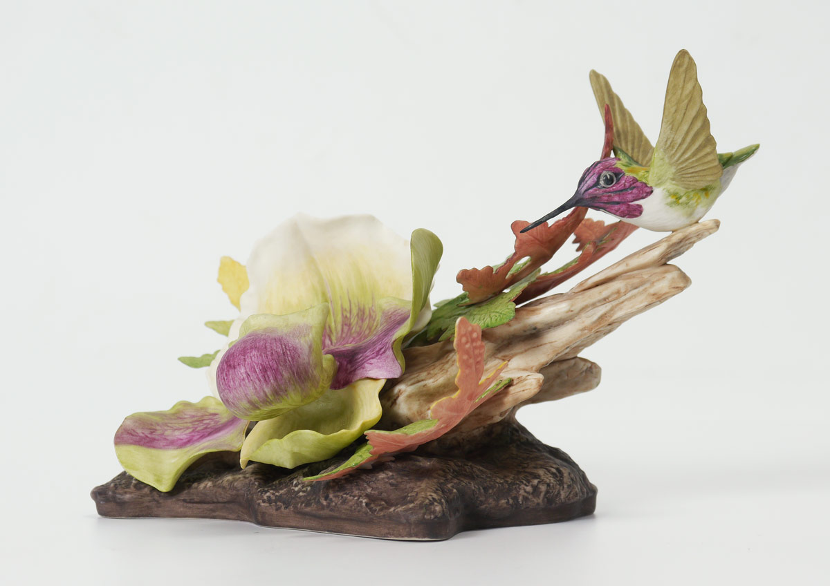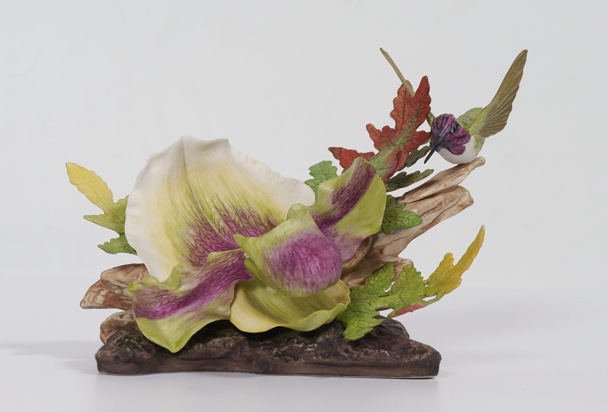 BOEHM PORCELAIN PAPHIOPEDILUM ORCHID & HUMMINGBIRD: #400-08, figural group of a hummingbird and a paphiopedilium (lady slipper) orchid. 5'' h. x 7 1/2'' x 5 1/2''.