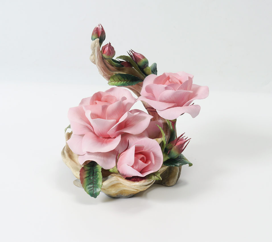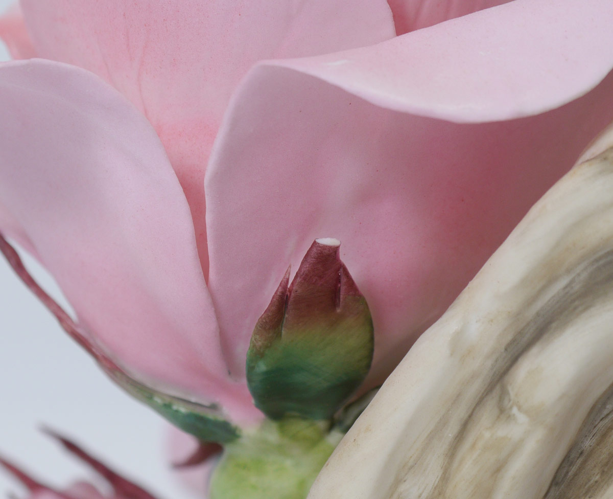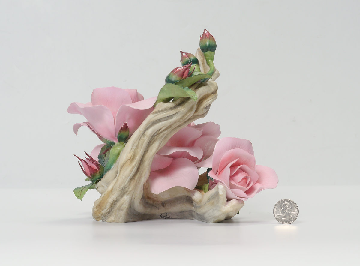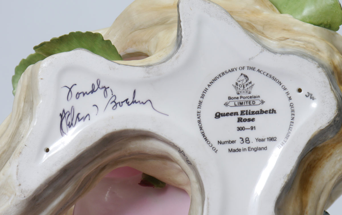 BOEHM PORCELAIN QUEEN ELIZABETH ROSE: #300-91 Queen Elizabeth Rose by Boehm, signed by Helen Boehm, #38, 1982. 7 3/4'' h. x 9'' x 7 3/4''.